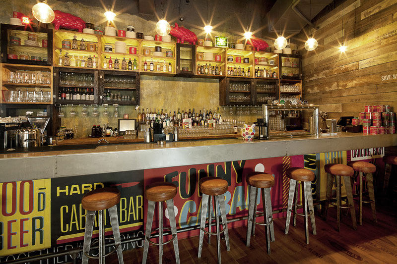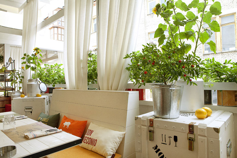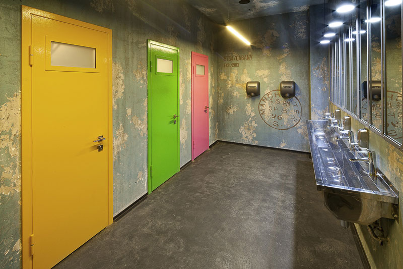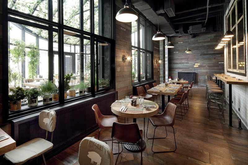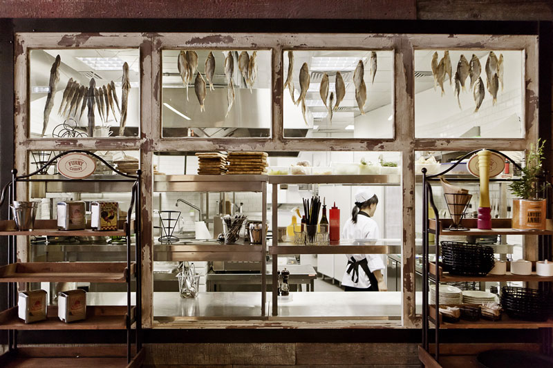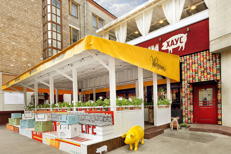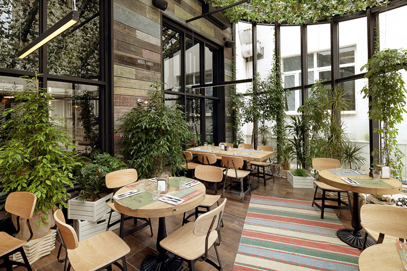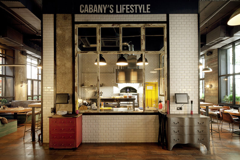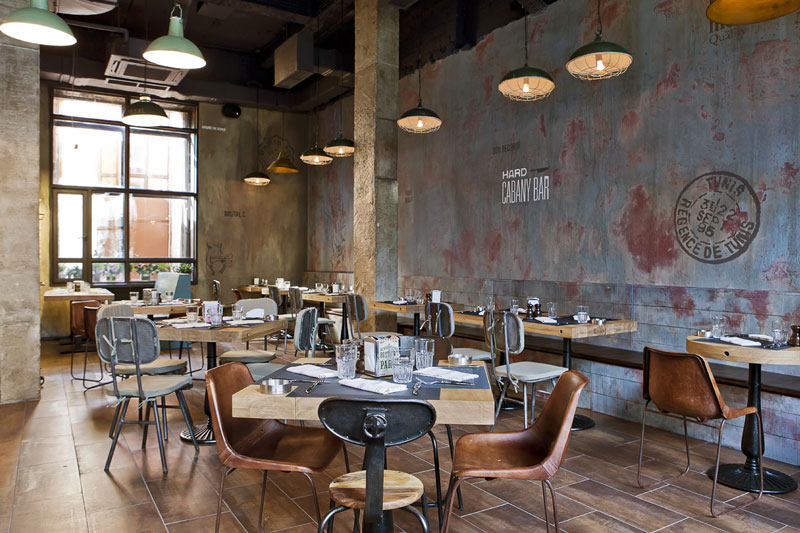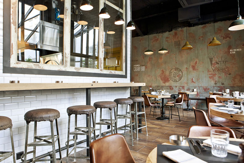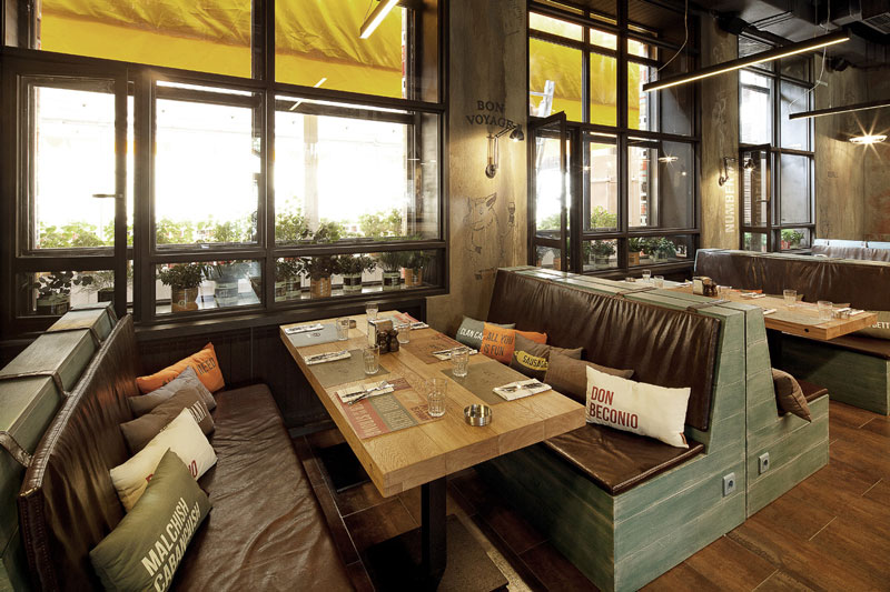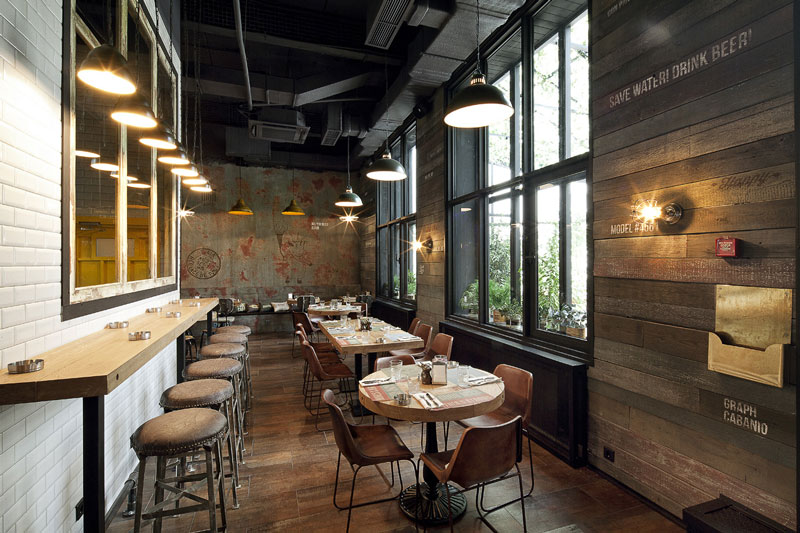 Since we seem to be on a roll with commercial spaces today, here is another one that was sent to us recently by G-sign, a small design studio in Moscow that specializes in branding and commercial design. This restaurant called Funny Cabany is so cool – I adore the centre tiled cube (the kitchen?), the use of reclaimed wood and industrial light fixtures, and OHHH those brown leather chairs!