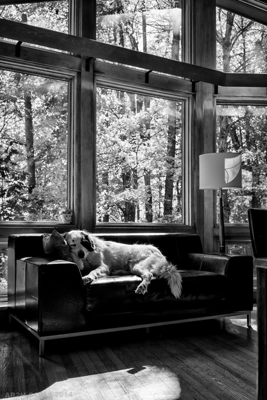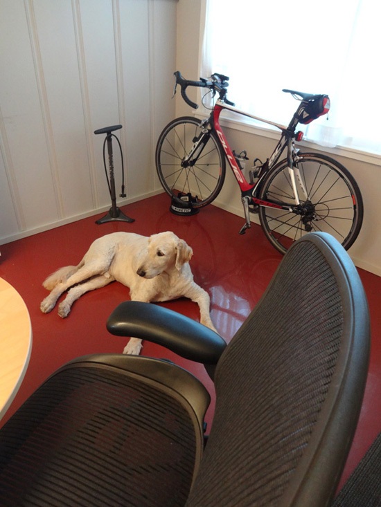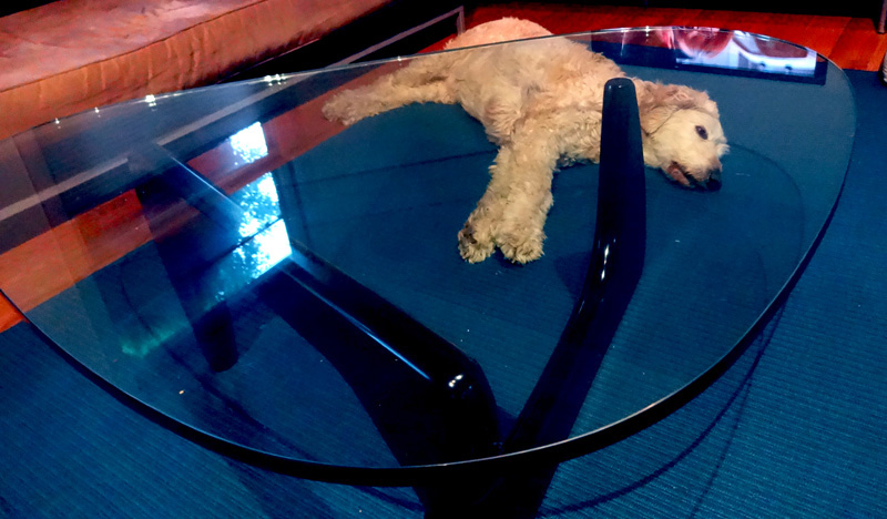 This is Sam the Goldendoodle. He likes the Noguchi coffee table because he can literally keep an eye on us from any spot he lays down on. In the office, his floor companions are a ten speed bicycle and an Aeron chair, neither of which he fancies.