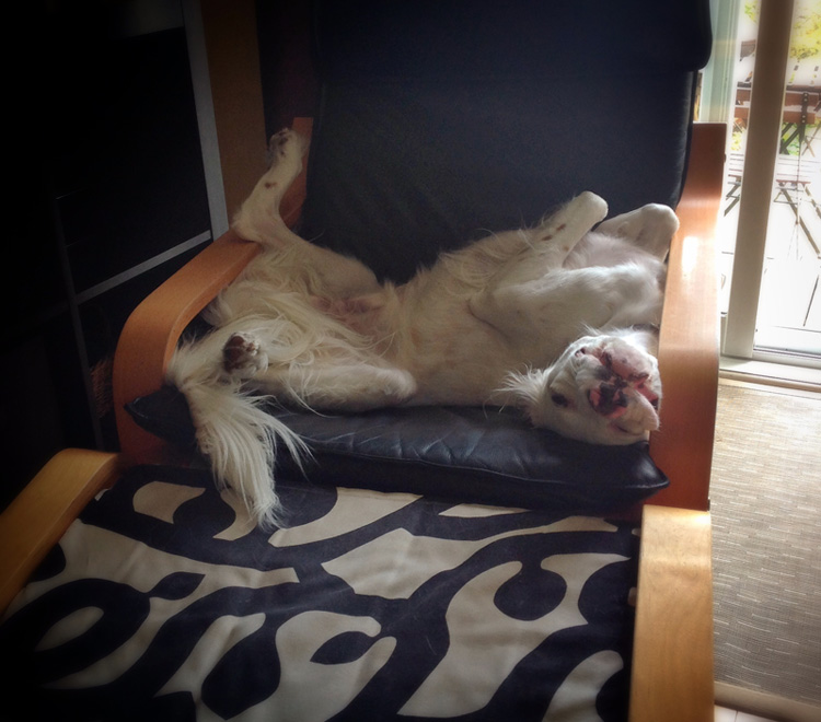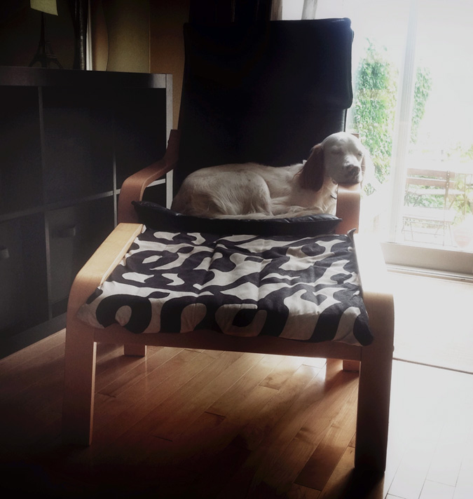 Attached are two photos of our English setter puppy, GIRO (as Giro d’Italia). He has been granted a black, leather IKEA poang chair with the footstool to extend on.