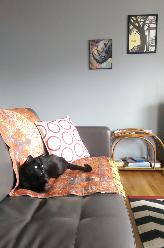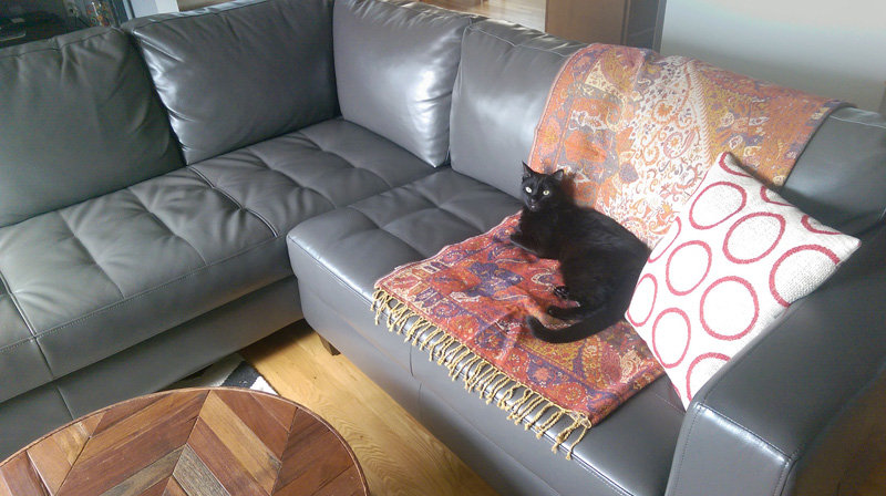 I just brought this new India inspired paisley throw home for the couch. My black kitty, Quinoa, took to it immediately and spent the day curled up on it. He usually doesn’t spend a lot of time on the couch with us so this inspired us to take a photo for Pets on Furniture!