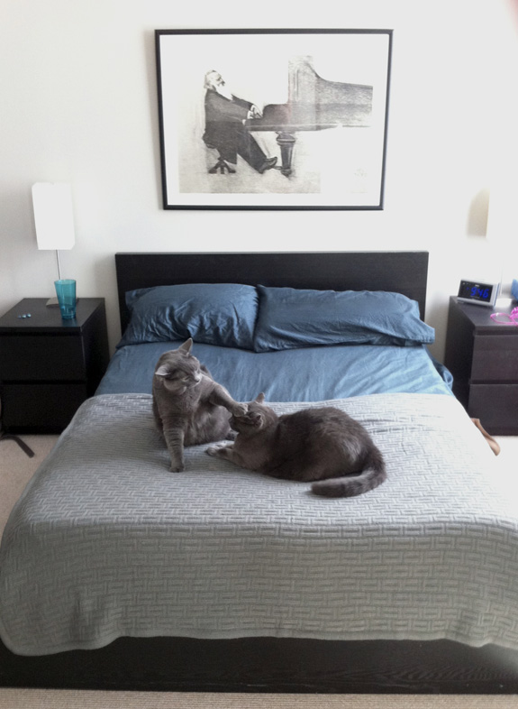 I have recently been helping my friend Gary and his two cats, Buzz and Mama, decorate their new Chicago apartment, and snapped this picture as the kitties were enjoying the newly organized bedroom. If nothing else, I think this picture sums up well what it’s like to live in close proximity to a sibling…