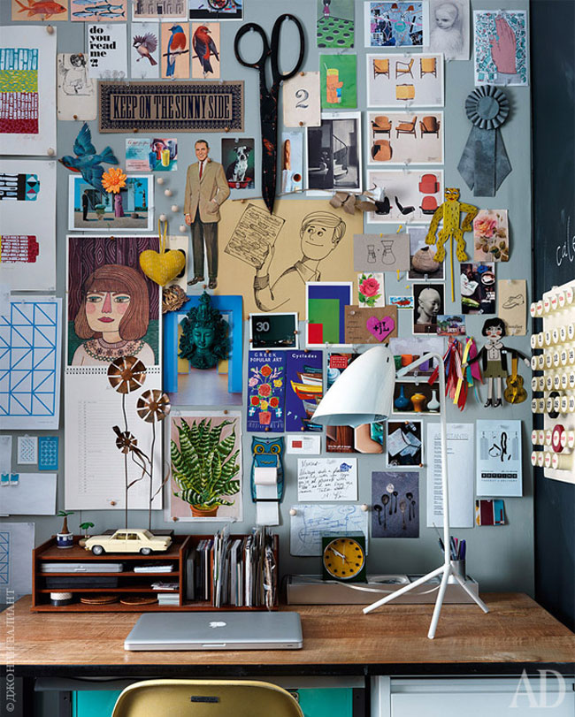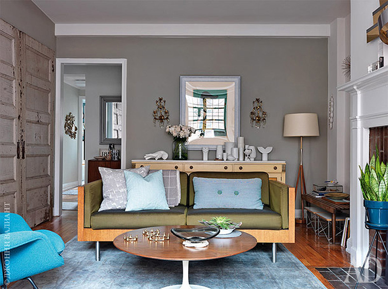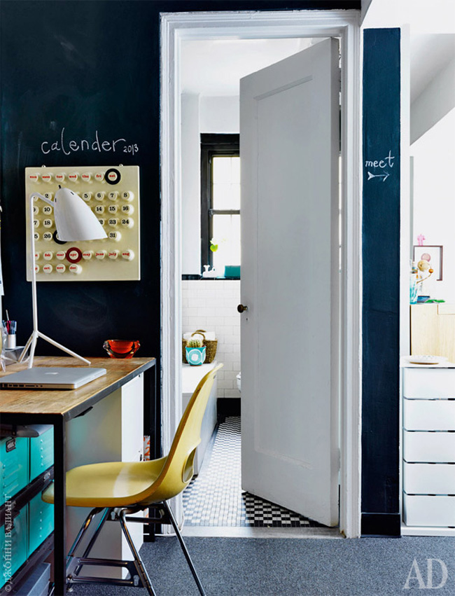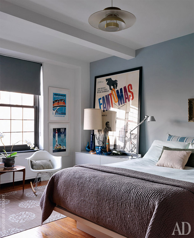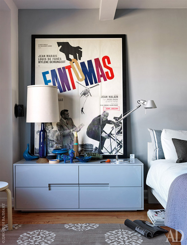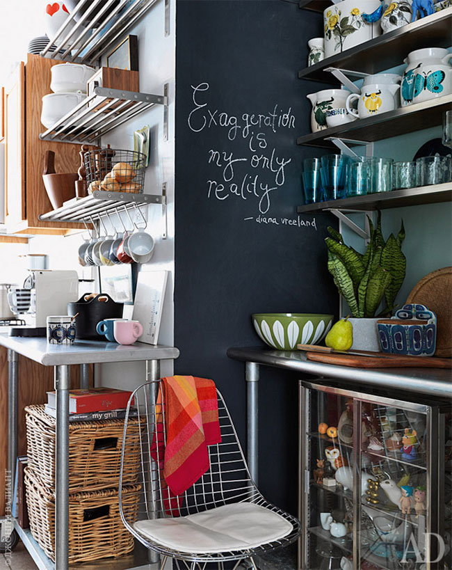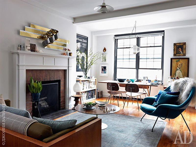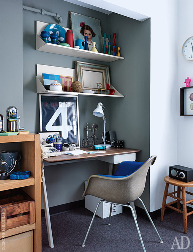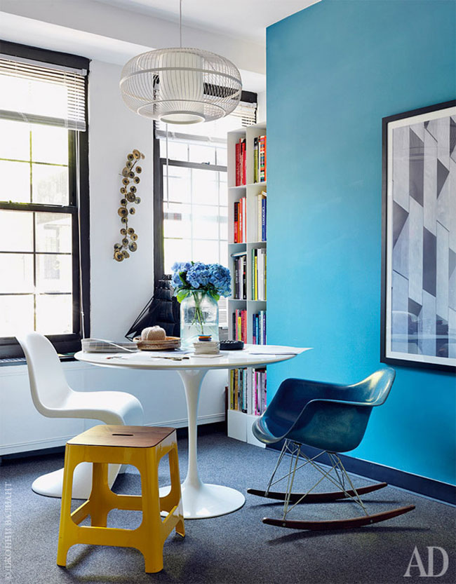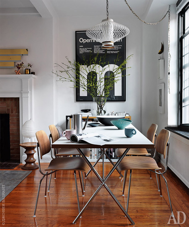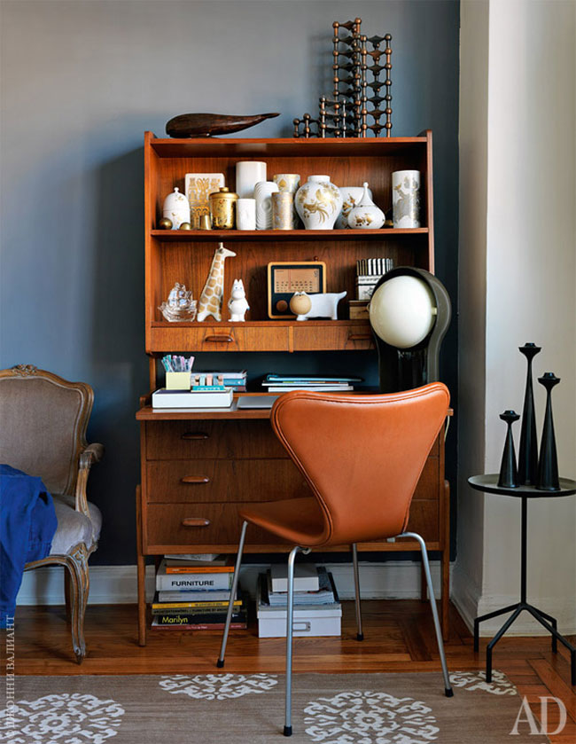 The last few days have been a little crazy. I thought I was going to rescue kittens on Thursday but the plan backfired. The husband and I drove to Montreal Friday to pick up our new tulip dining chairs (and ended up also bringing back a headboard and bedside tables), then we spent the evening at Ikea because we found out one year that Halloween is the BEST day to go. I bought a new desk there that turned out AWESOME (photos to come soon). Yesterday we went to the Third World Bazaar, which I should point out is only open for a handful of weekends around Thanksgiving every year so there are only 2 left, and I scored some gorgeous kilim rugs to hide my icky yellow/orange stained hardwood (photos of that soon too). Today I have to paint the living room alcoves (I was supposed to start yesterday but ran out of time) and then it will finally be finished! 4 freaking weekends! AAGGHH!!! Needless to say I only had a few moments to spare to find something to blog today. I came across this apartment and had to share mostly because it is a chair porn extravaganza! The space, located in New York, belongs to stylist and designer Marcus Hay and was featured in Architectural Digest Russia. Marcus is a collector, and he is very smart about grouping his collections in small vignettes so the compact space doesn’t look overcrowded.