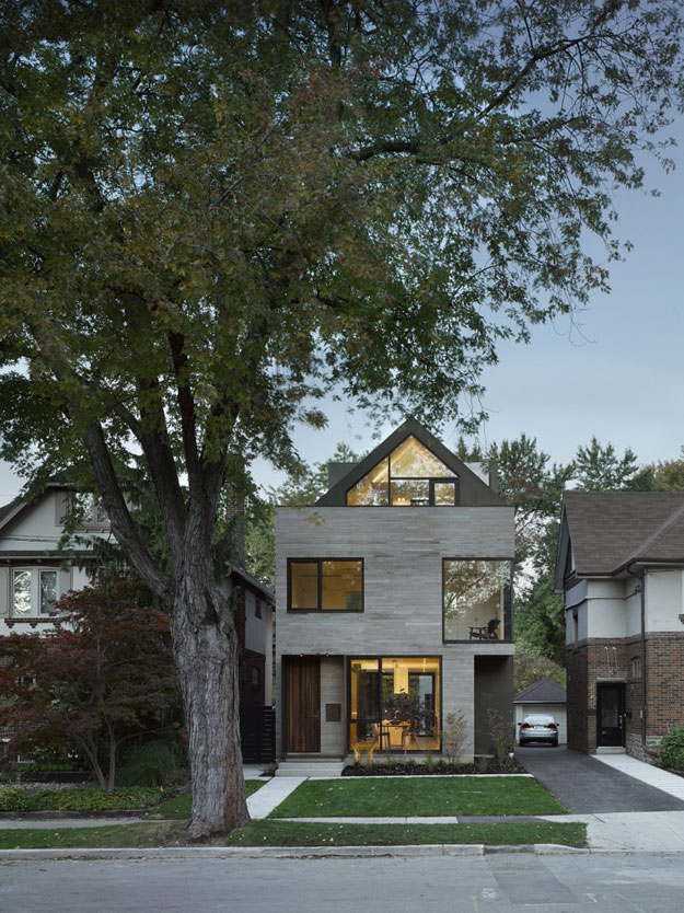 I have always been intrigued by infill projects (especially over the past couple of years when I thought I was going to take on my own infill build). To see what an architect can come up with – does it blend with neighbouring homes, does it stick out like a sore thumb? And how does it make use of the typically small parcel of land it inhabits? In this case it is a much more modern residence than the surrounding 1920s homes, but it works. The exterior brick and the peaked rook mimics the homes on either side. And a simple yet brilliant idea to have a strip of different flooring material on the ground floor to give the impression of a corridor. Kudos to Drew Mandel Architects on this one.