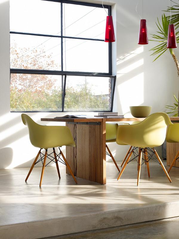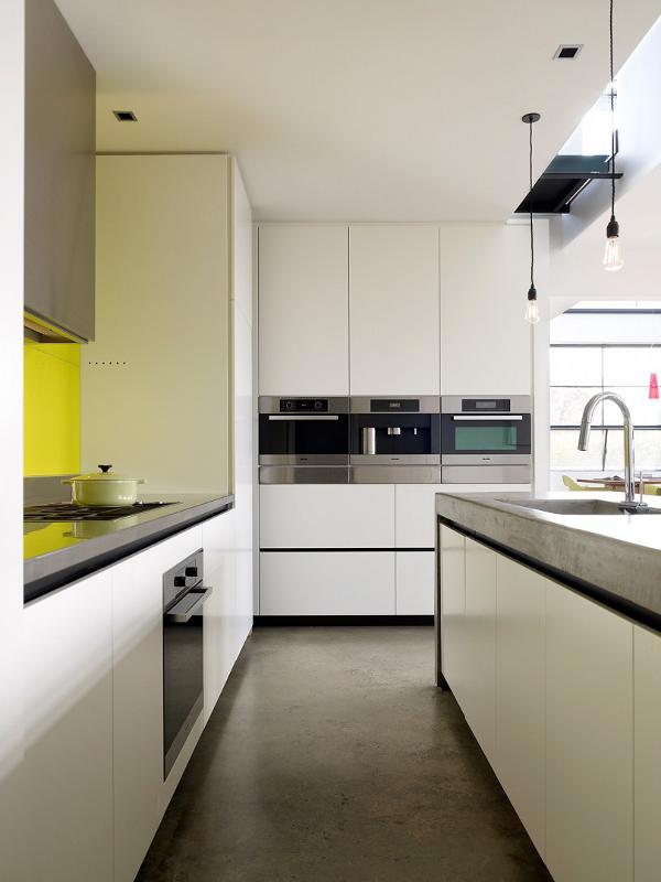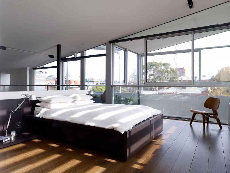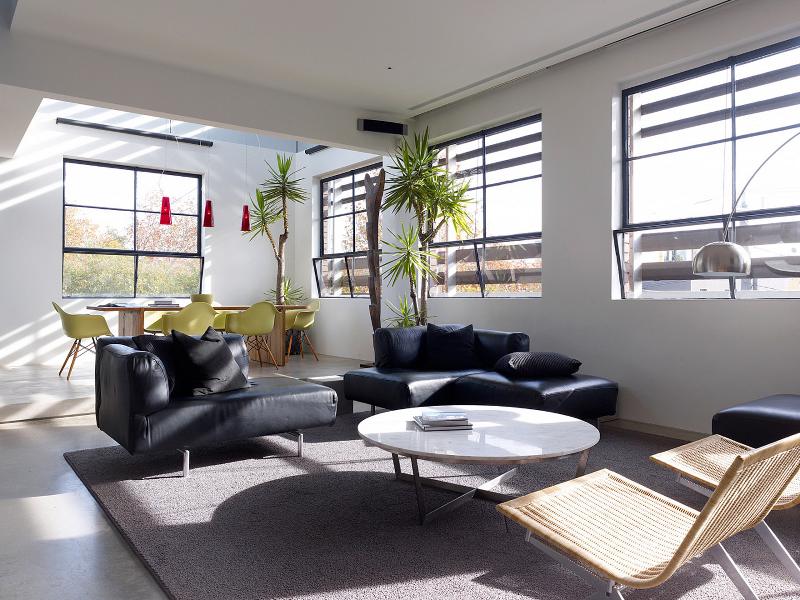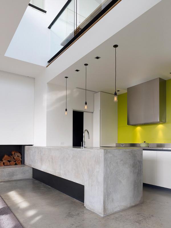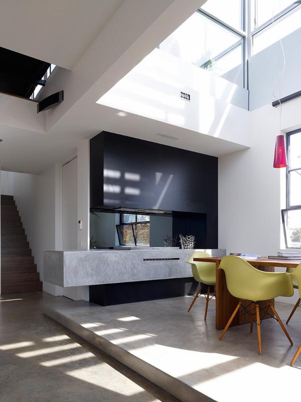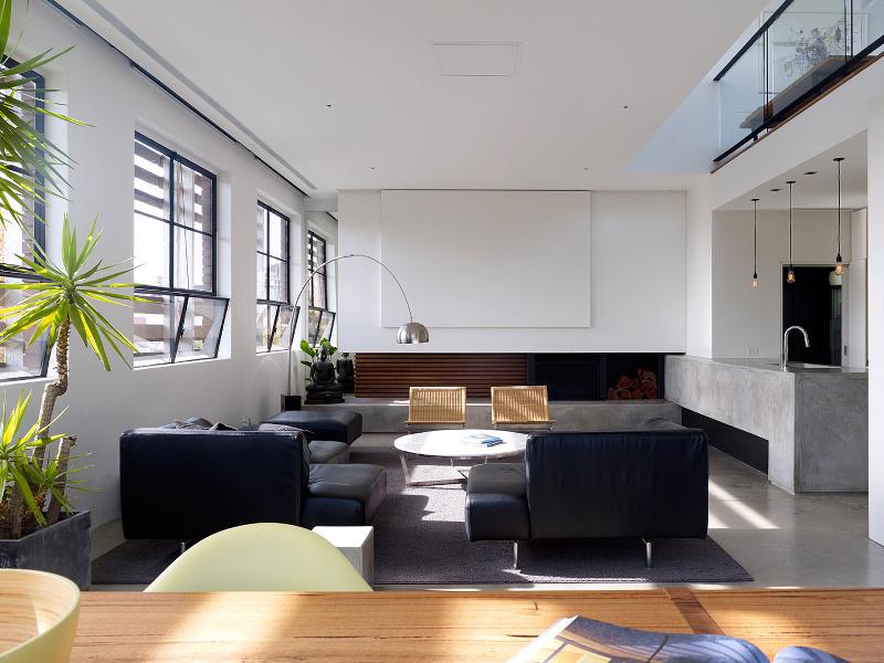 The architect’s own warehouse space. Raw and restrained with a shock of acid green in the kitchen, open plan with changing levels to allow privacy, all washed with the natural light pouring through large windows. Modern urban living with a cool luxury. Young St, Fitzroy by Steve Domoney Architecture.