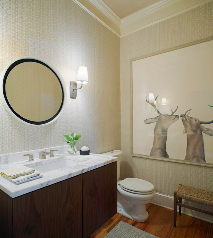 The deer art in the bathroom is by Jen Zelniak
