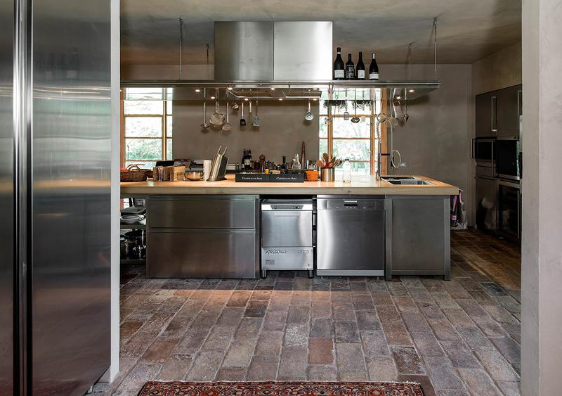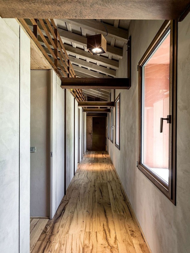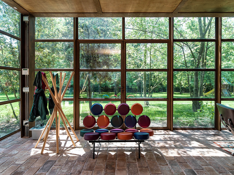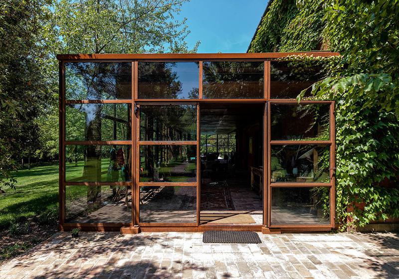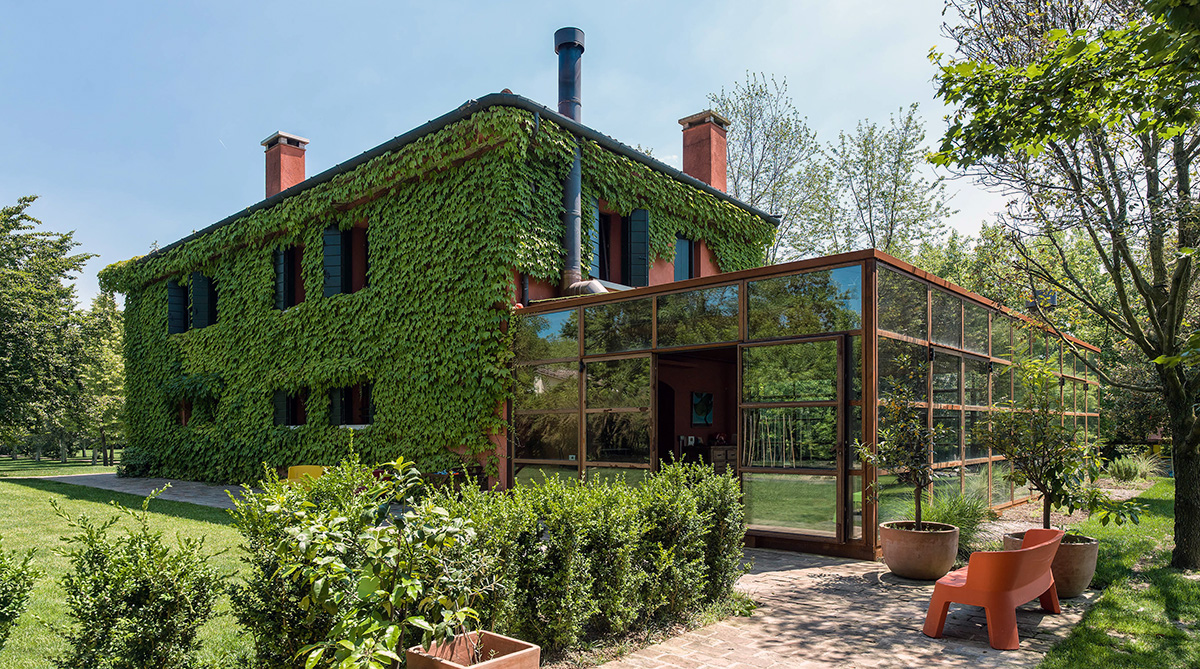 Italian design firm zanon architetti associati have breathed new life into this old Treviso country villa. The ground floor as become one large room while glass windows on the box like extension reflect the garden blurring the edges between inside and out. Vines grow up over the terracotta hued house and corten steel weathers to match the render. New and renewal, modern and traditional.