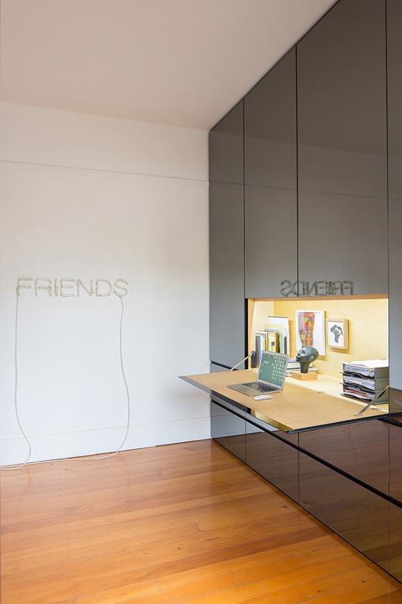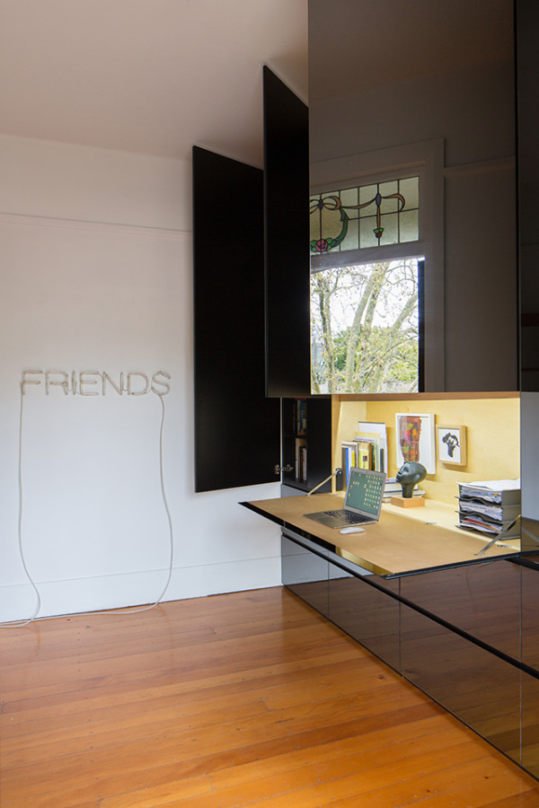 It’s called an apartment for a writer. Perhaps an apartment for an observer. For someone who reflects on their surrounds. Holds a mirror to the world and records, writes. Or perhaps is vain? Cares about looks and style. No that would be more likely if the mirror lined the desk space. Either way I’m smitten by this clever storage by Auckland based Cheshire Architects.
