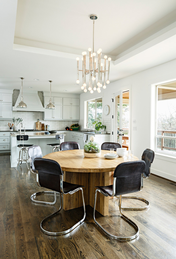 Love the wooden table and chandelier. It's gorgeous!