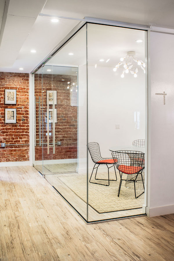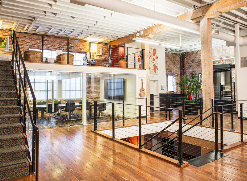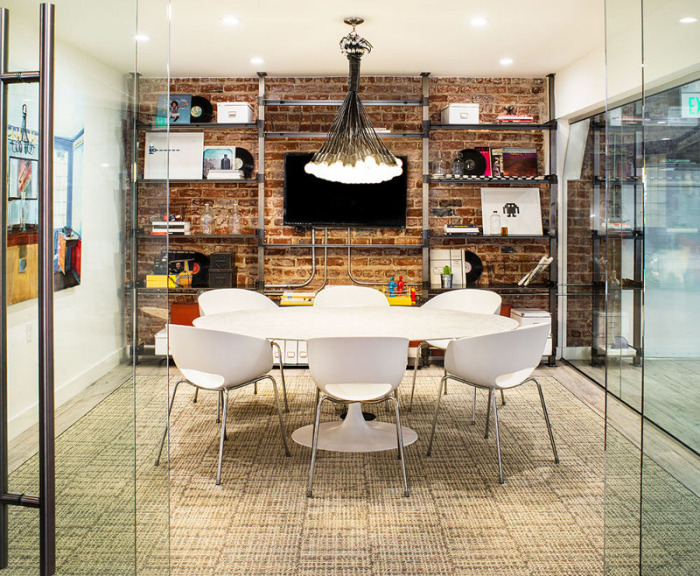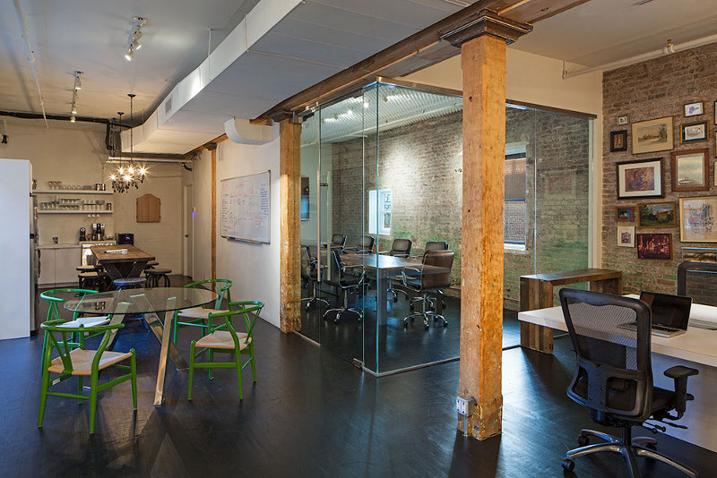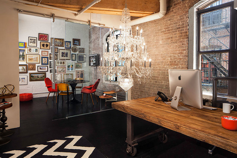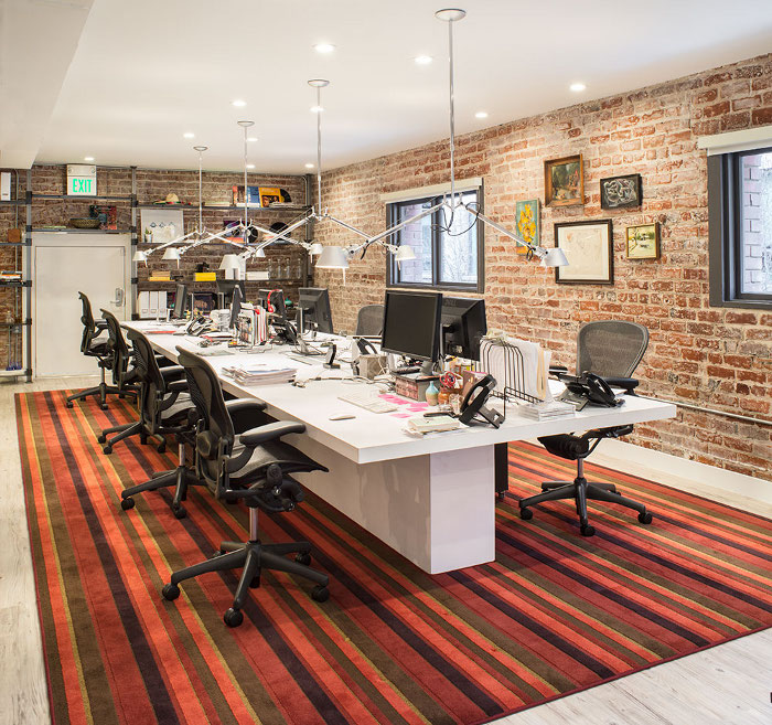 The gallery walls in the NYC office are amazing! That is a lot of holes in that poor brick though. Using cable display systems or rails for pictures is a great way to avoid all those holes and make hanging art and other visual media more versatile.