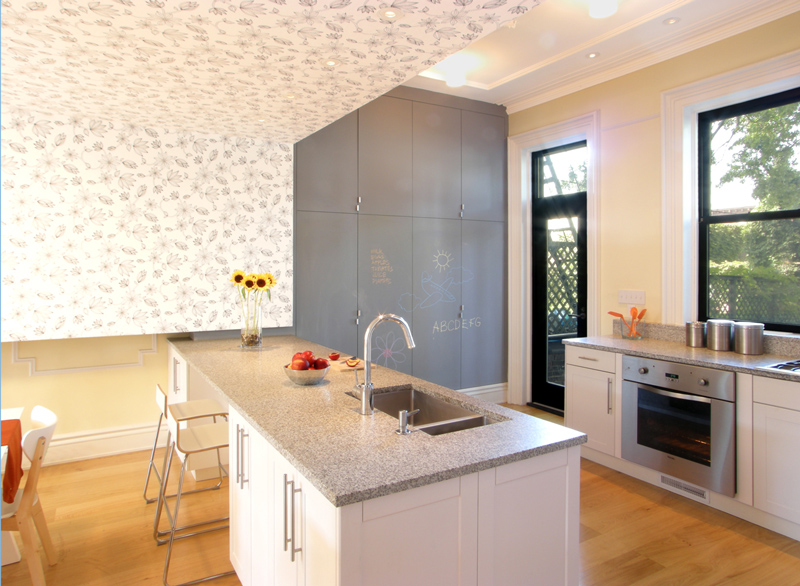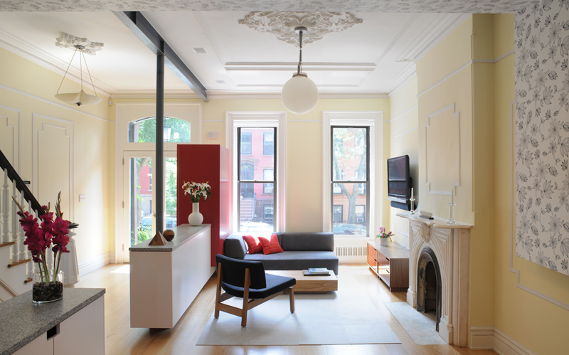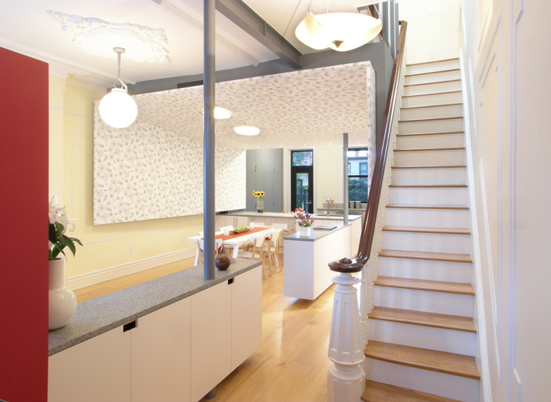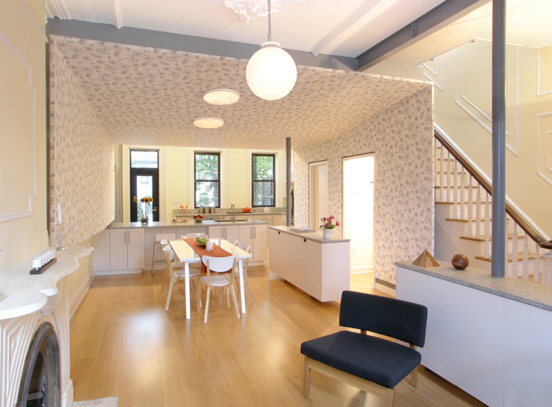 I found myself on the website of James Cleary Architecture a while ago and was…dumfounded by this gut renovation of a Park Slope brownstone. To note in particular, the playful pod that wraps the dining area’s walls and ceiling. The pod gives this space its own presence within the larger room while concealing HVAC equipment and the building’s plumbing risers from sight. Perhaps I am really on the fence with this concept because I cannot tear myself away from the horror of the pale yellow walls, and when combined with red accents and a floral wallpaper that really does nothing for me…but I am finding this “pod” very cavelike and bizarre. I think the kitchen cabinetry set up along the entire space is not really something I would have done either. It is a stunning home and I imagine a vast improvement from before the renovation, but this one is throwing me for a loop. Thoughts?
