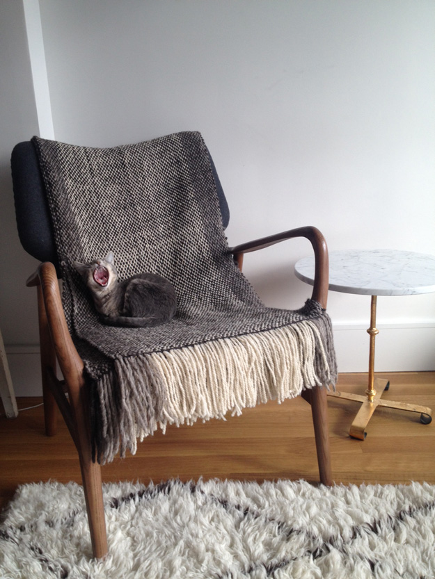 This is my new kitten Soetkin (Sootie) yawning on my husband’s Patrik Accent chair. It’s protected with a hand loomed serape that my friends brought me from Argentina. The little table was my mother’s. I gilded the base and added a marble top from an off cut of our kitchen counter. The wall is waiting for some art!