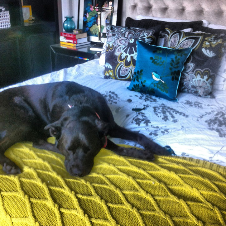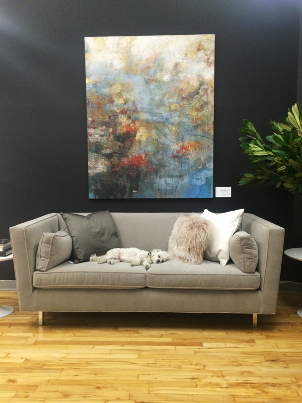My pup (Professor Cumulus – Informally Known As Abbie) is passed out on a Mitchell Gold sofa at the interior design firm where I work. She comes to the office with me every day and this was a long one. More information about the artwork above her is here.