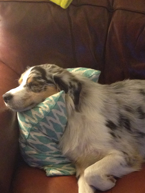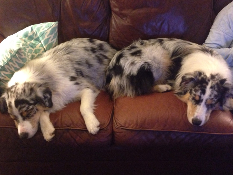 Thought you might enjoy photos of our Australian Shepherds relaxing on our vintage leather sofa. In the first photograph, Spur has appropriated one of my John Robshaw pillows as his own. In the second pic, both Spur and his brother, Iko, are taking a post-play snooze.
