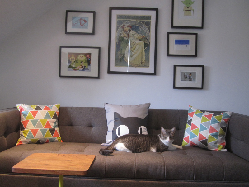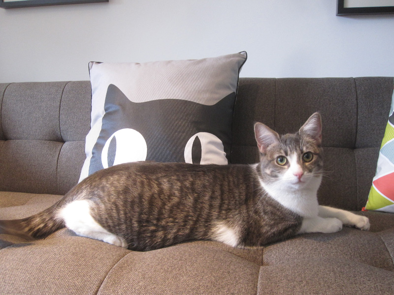 I look forward to this feature every week and while I didn’t have a chance to send photos of our last cat (RIP), I’m happy to submit a couple of pics of our new kitty, adopted from the local shelter about a month ago.  She’s settling in beautifully. In these two photos, Princess Miu Miu is lounging on our Gus Modern sofa, keeping my husband company in his home office.