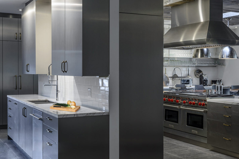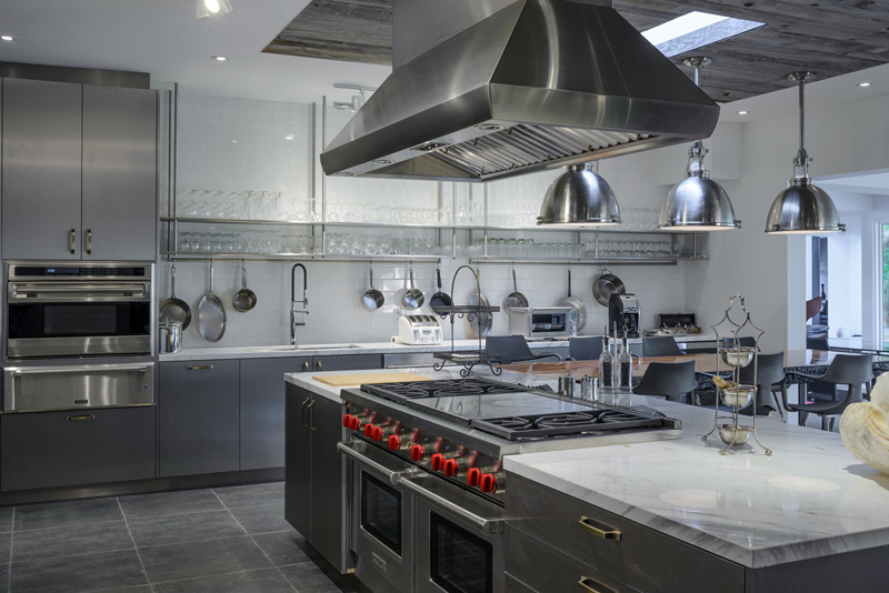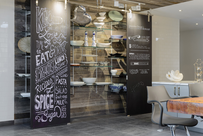 The folks of Toronto design firm Prototype Design Lab sent along photos of a project they recently completed that I had to share. This is a family cottage in northern Ontario (McKellar) and it is unlike any ‘cottage’ I have ever seen. When I think cottage I envision pine panelled walls, a rustic kitchen and some antlers on the wall. This cottage IS NOT THAT. We designed this cottage for a family that loves to entertain, cook, and eat. Their whole lifestyle is based around the kitchen, so right off the bat we knew that this space had to be functional, but incredible. The kitchen starts out like a restaurant kitchen, with durable, stainless steel surfaces, but is designed to be warm and eclectic with a great mix of modern & vintage fixtures; pendant lamps, floating shelves and stunning blackened steel-framed chalkboard panels acting as cabinet doors. Then there are some really warm elements such as a reclaimed barn wood wall & ceiling feature, marble counter tops, glass shelving & and reclaimed wine crate table. The palette of the space suggest vintage, contemporary and industrial all at the same time!