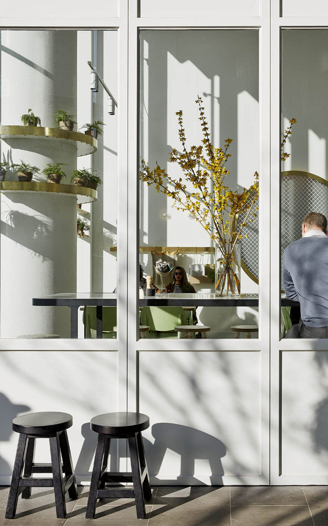 Now on my list of places to visit — soon! Love the light, the feeling of spaciousness, the sweet typography, the tiles segueing into the concrete floor, and most of all that très élégant interlocking-rings pendant light. Just stunning.