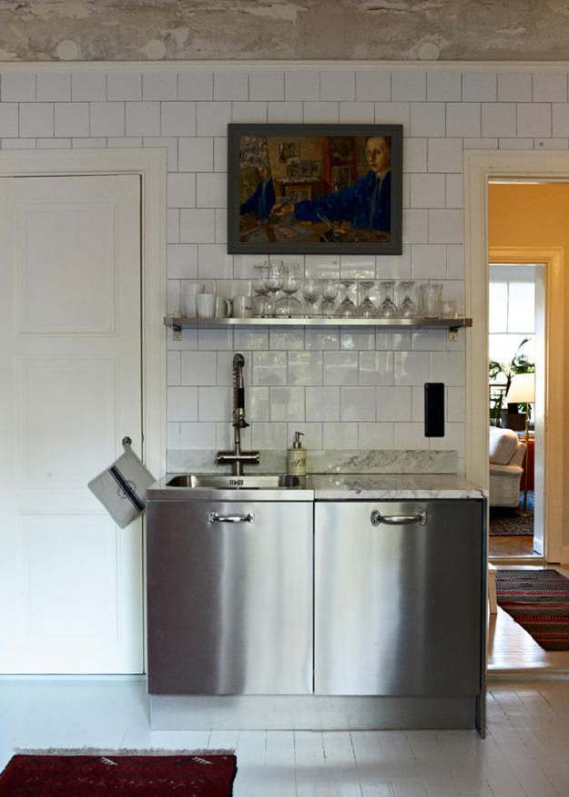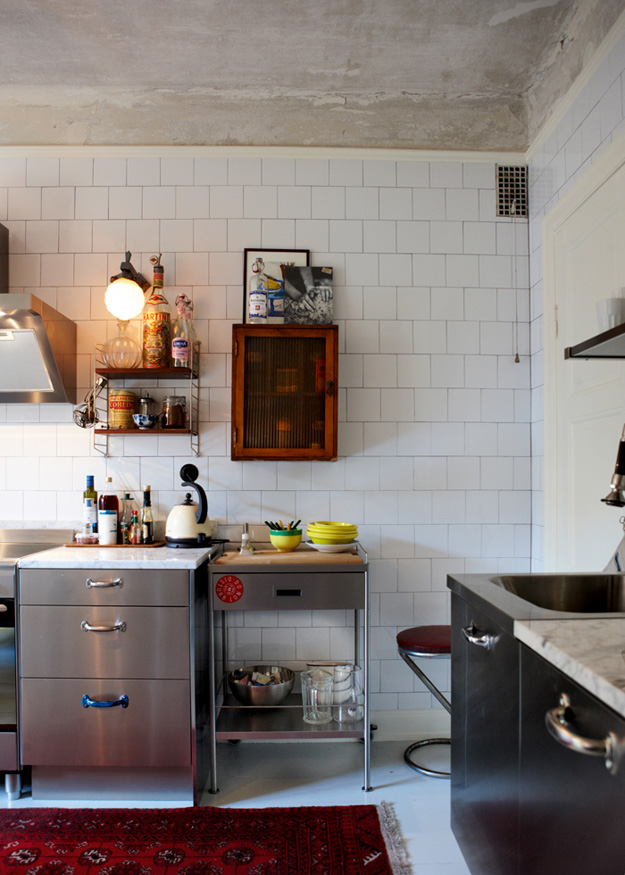 This kitchen in a 1920s apartment in Stockholm featured in Elle Decoration Sweden is absolutely gorgeous. It was totally renovated but they maintained the peeling and cracked ceiling, added some Ikea cabinetry mixed with vintage pieces, Carrera marble, tiled walls, funky lighting… The resulting space looks like it has been there since the 20’s. SWOON! (photos: Martin Löf)