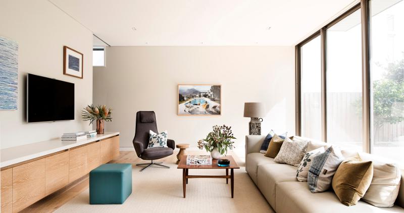 Modern beach house living. A colour palette of sea and sand. Clean lined contemporary take on an endless summer of family and friends. Clovelly House by one of my favourite designers Brett Mickan Interior Design. Photography by Thomas Dalhoff.