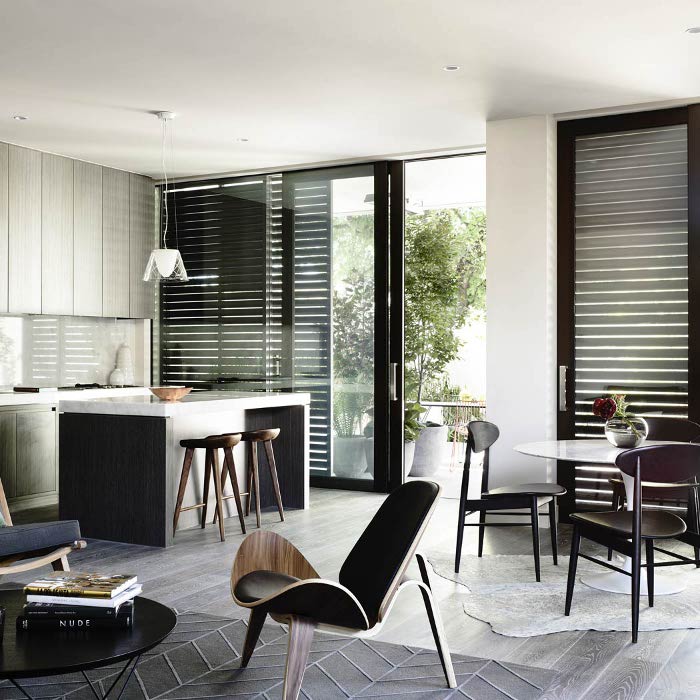 Bayside Apartments designed by Melbourne-based Rob Mills Architects and Interior Designers. Ultra contemporary with a simple colour palette and natural finishes of stone and timber. Sleek, stylish, modern living.