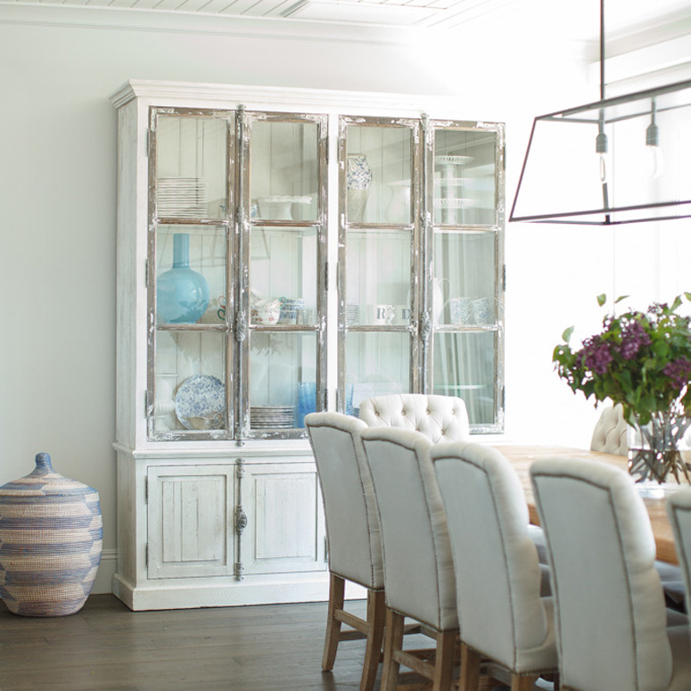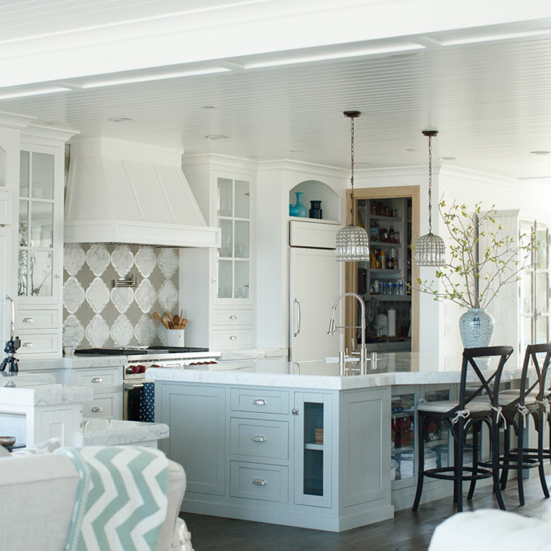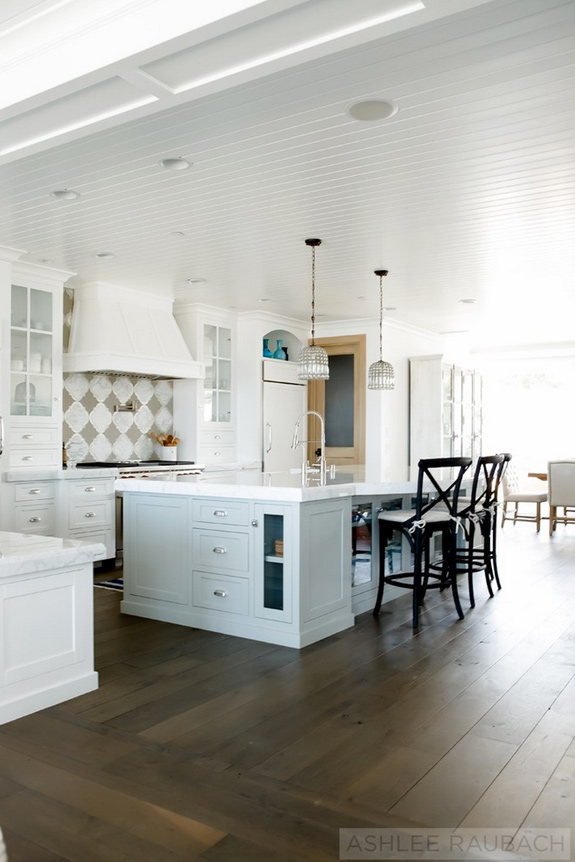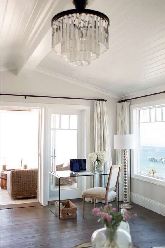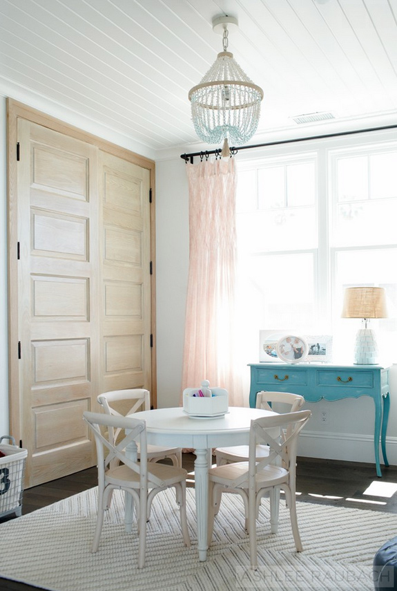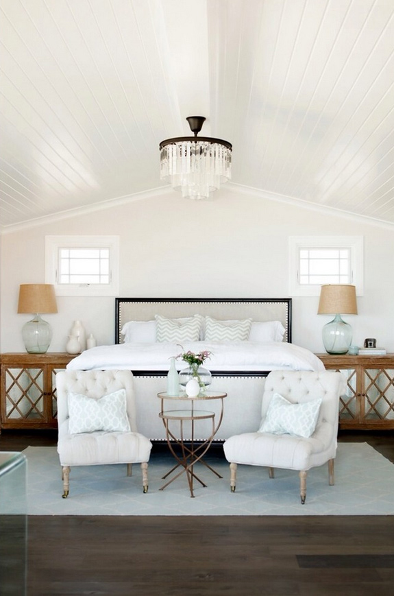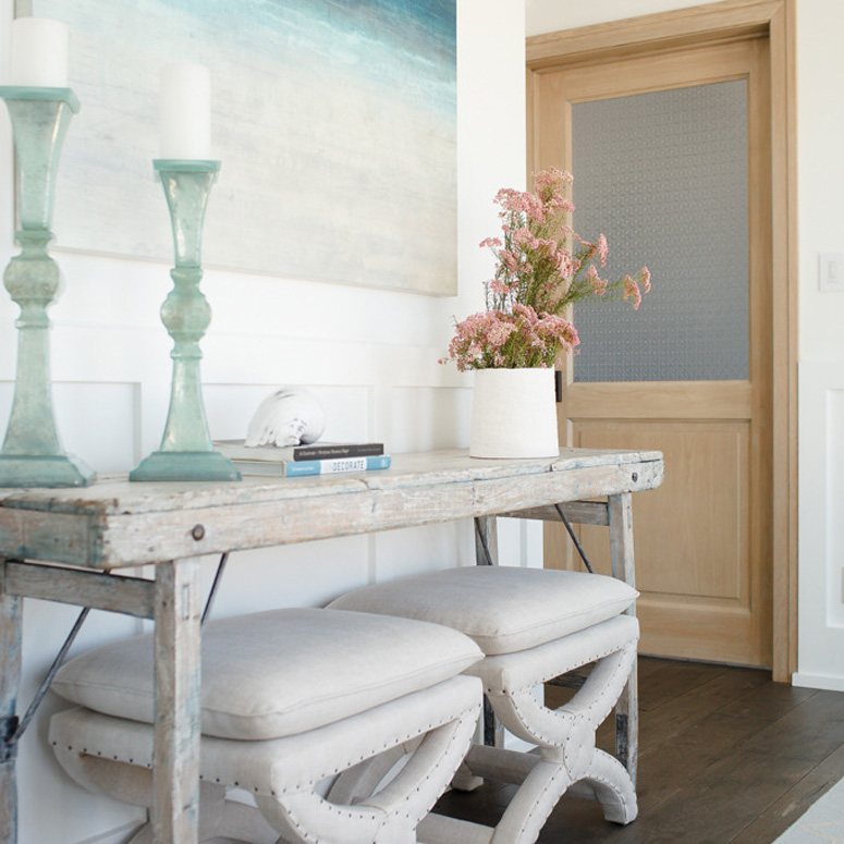 Soothing shades of white, cream, blue, grey and green. This is beach decor at its absolute finest, in this California beach house by interior designer Becki Owens. It is classy yet weathered, with lots of cozy upholstery and bits of sparkle and pattern to catch your eye. This is just super pretty.