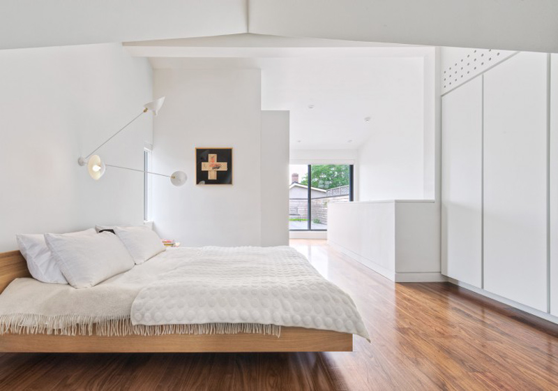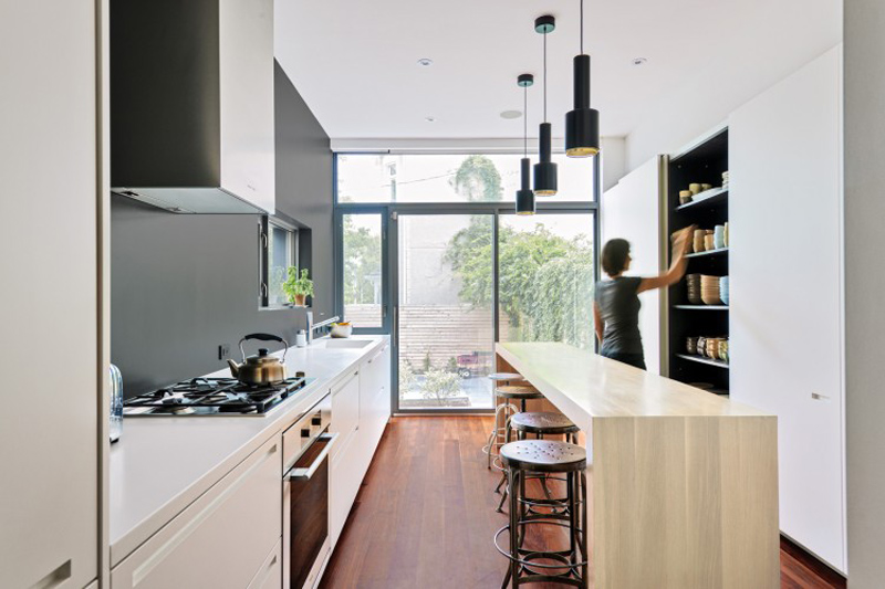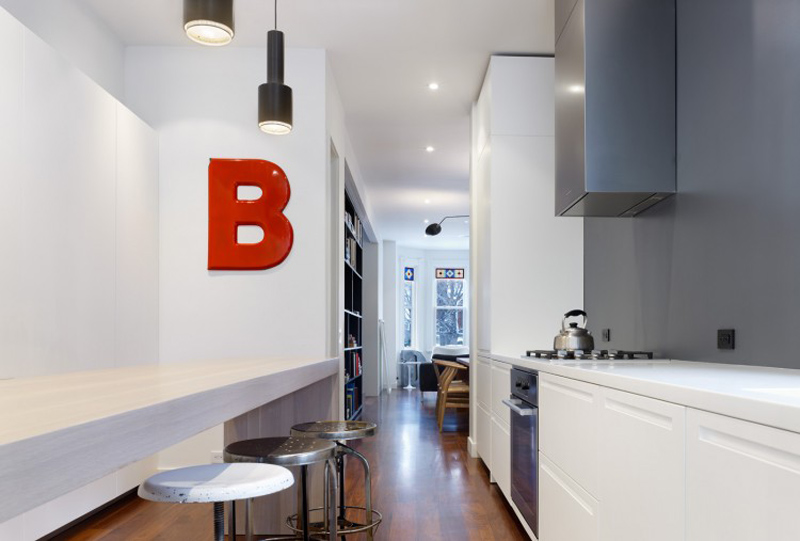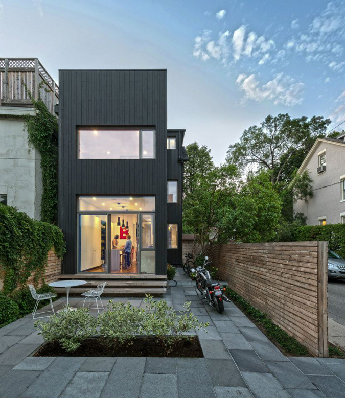 How to modernize an old home on a tiny lot and make it the best house on the street! The intent of the remaking of this narrow 125-year-old residence was two-fold: to increase natural light in the interior using contrast, and to reduce the house’s ecological impact.An increase of natural light is accomplished through both physical and perceptual means. Physically, the long, narrow house – only 11 feet wide on the rear façade – was reconfigured to allow direct sight lines to new window openings. Perceptually, contrast was used as a means to “brighten” internal spaces without direct access to natural light. Contrasting elements are placed in proximity to produce an intensified effect. At each level, the stair is punctuated by a black element to define space — be it floating bookcases housing the owner’s collectibles, or a chalk board wall for play — and to create contrast to visually intensify the natural light spilling down from above. Via Toronto’s Dubbeldam Architecture + Design