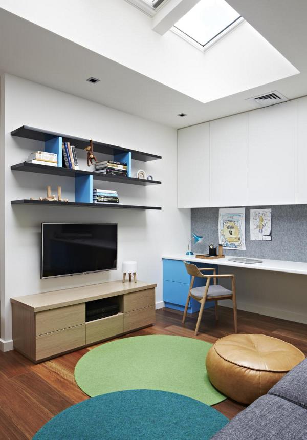 How to modernize an old home on a tiny lot and make it the best house on the street! The intent of the remaking of this narrow 125-year-old residence was two-fold: to increase natural light in the interior using contrast, and to reduce the house’s ecological impact.An increase of natural light is accomplished through both physical and perceptual means. Physically, the long, narrow house – only 11 feet wide on the rear façade – was reconfigured to allow direct sight lines to new window openings. Perceptually, contrast was used as a means to “brighten” internal spaces without direct access to natural light. Contrasting elements are placed in proximity to produce an intensified effect. At each level, the stair is punctuated by a black element to define space — be it floating bookcases housing the owner’s collectibles, or a chalk board wall for play — and to create contrast to visually intensify the natural light spilling down from above. Via Toronto’s Dubbeldam Architecture + Design