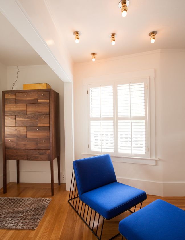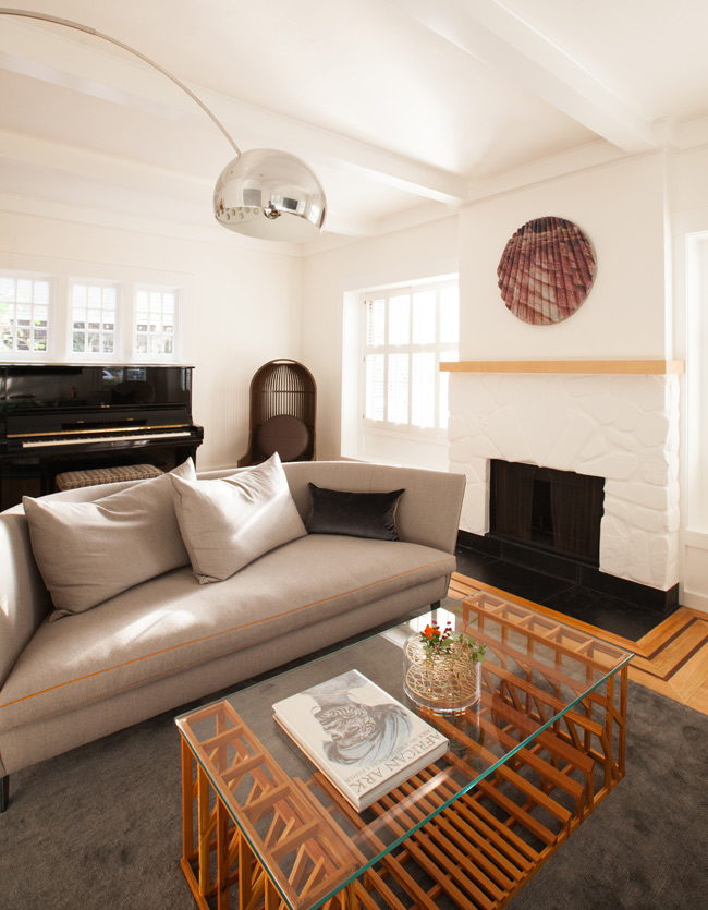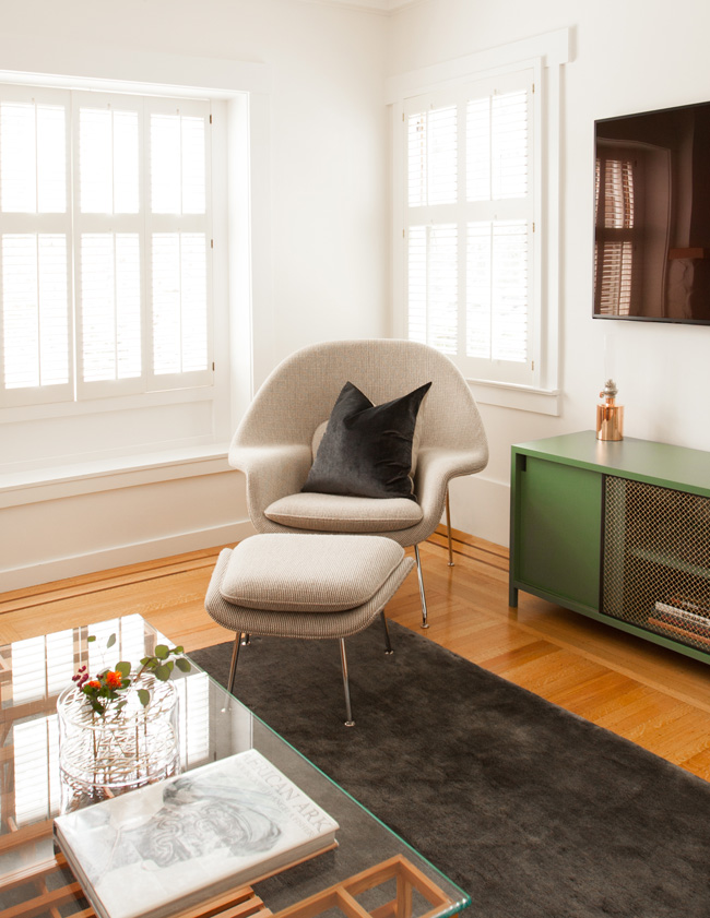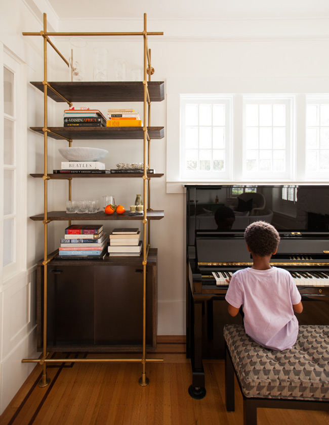 Here is another project by the talented interior design firm Geremia Design. This one is amaaaaazing with some serious mid-century classics (Eames lounge, Saarinen womb chair, Bertoia diamond chair, Kofod-Larsen chair etc.) and OMG my yellow/orange stained floors! I guess when you have some seriously nice furniture and lighting all over it distracts you from the not-so-cool bits. That adorable kid is distracting too. 🙂 (Photos: Melissa Kaseman)