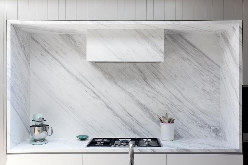 The sweep of marble in the kitchen is gorgeous, but I can't get past the short-sightedness of using expensive porous stone behind a stovetop. Within a year there will be an indelible yellow smear of oil and grime across that beautiful marble, like a gross sunset.