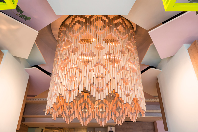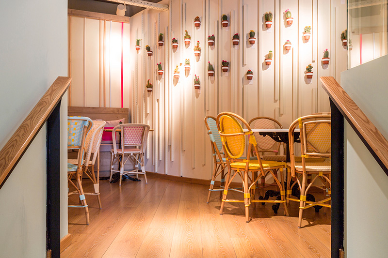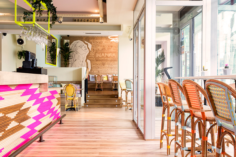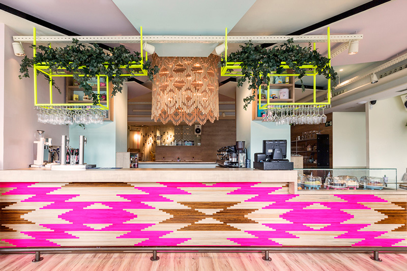 This has got to be the prettiest café I have ever seen. Wanda Café Optimista is located in Madrid and was designed by Parolio. After the recent years, of recession in Madrid, Parolio wanted to design a place that communicates the opposite: projecting vitality, joy, color and a positive outlook on life. The idea is that when you enter Wanda you enter the emotional universe of vacations, summer, Surf and everything positive you feel on these fun days of the year. Inside Wanda it’s always sunny, there is always a good vibe. That description alone would have me stopping in. The pastel colours with pops of neon, all of the really cute patterned pillows and the amazing pattern on the bar make this such a happy place, where you would never want to take your last sip of coffee. (Photos: Juan Baraja)