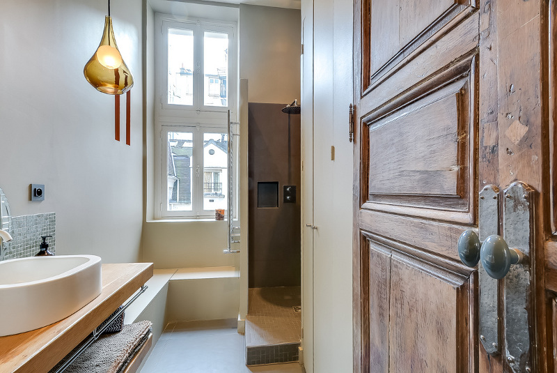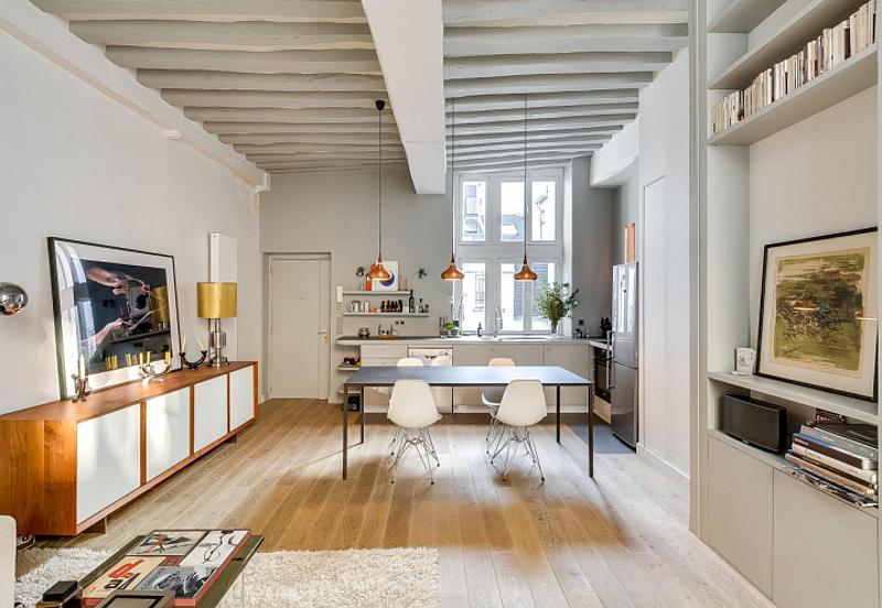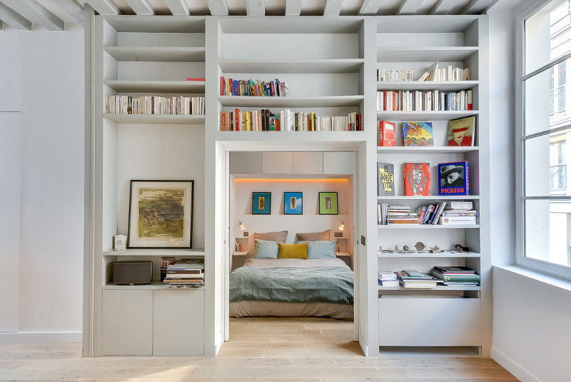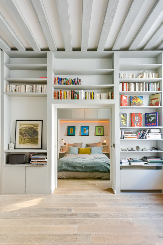 Bright, cheery, light and fun. Not your usual brooding, heavy on the masculine cliché bachelor pad. At 50 sq m open plan living and full height storage make the most of the space while still being cosy and inviting. Garçonnière Marais by Parisian interior designer Tatiana Nicol.