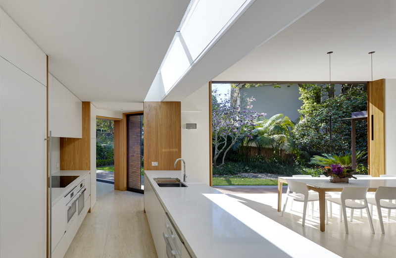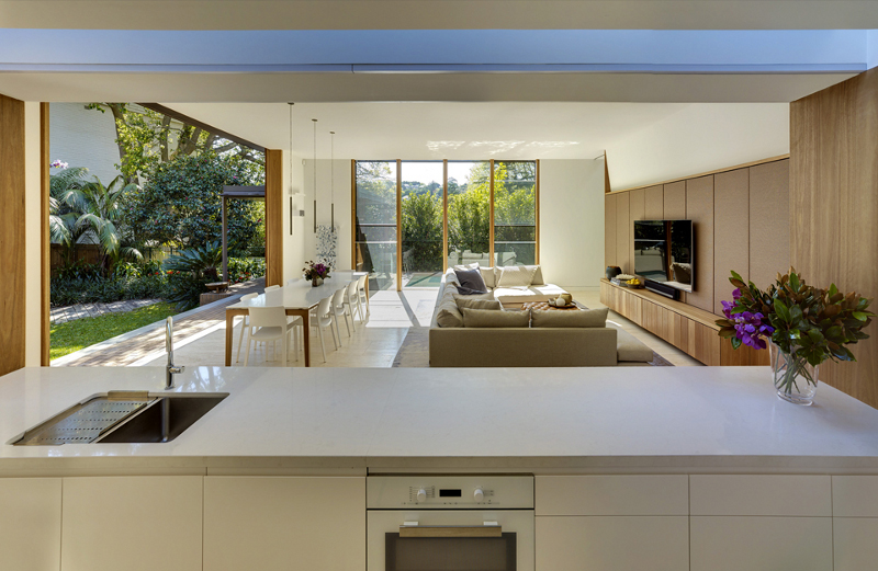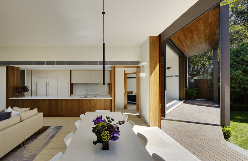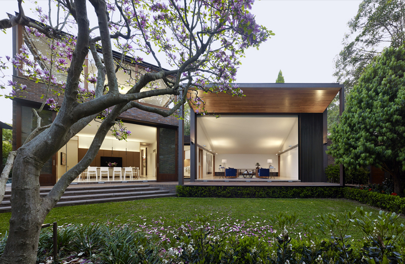 The two intersecting blocks that comprise this Woollahra house by Sydney-based architectural firm Tzannes Associates have been arranged to suit an irregular site. More so they are like two giant arms wide open to embrace the outside. With walls and windows that slide and concertina the interiors become part of the garden. What a joy to have that flowering magnolia as part of your living room.