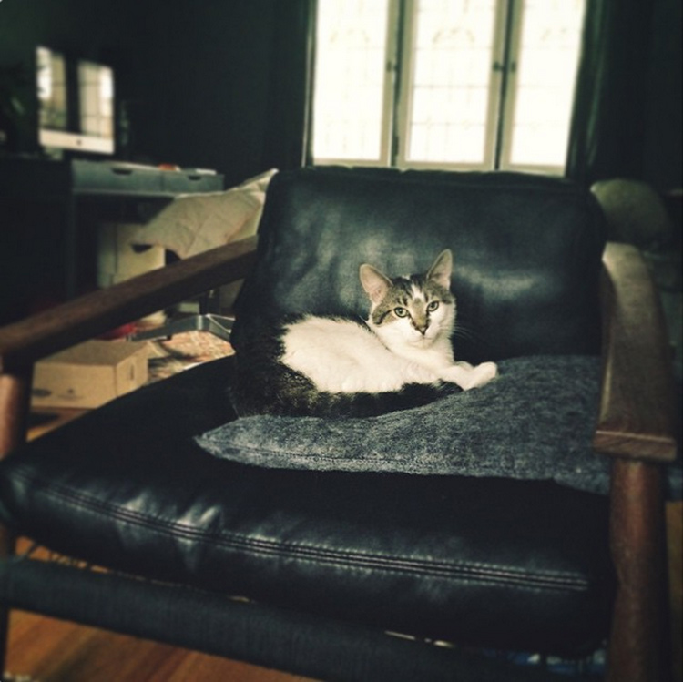 This is Pants, who hops wherever he pleases, on my George Nelson for Herman Miller modular sofa. My great grandfather built the coffee table around 1930.