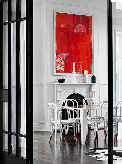 I adore that red modern art over the antique fireplace mantel and the dip dyed chairs.