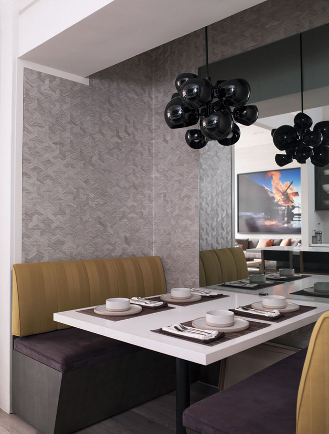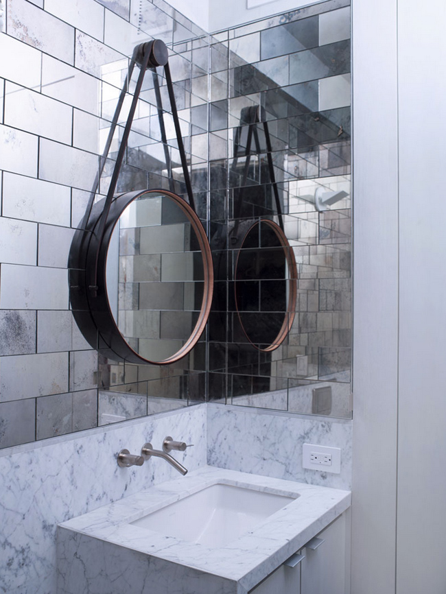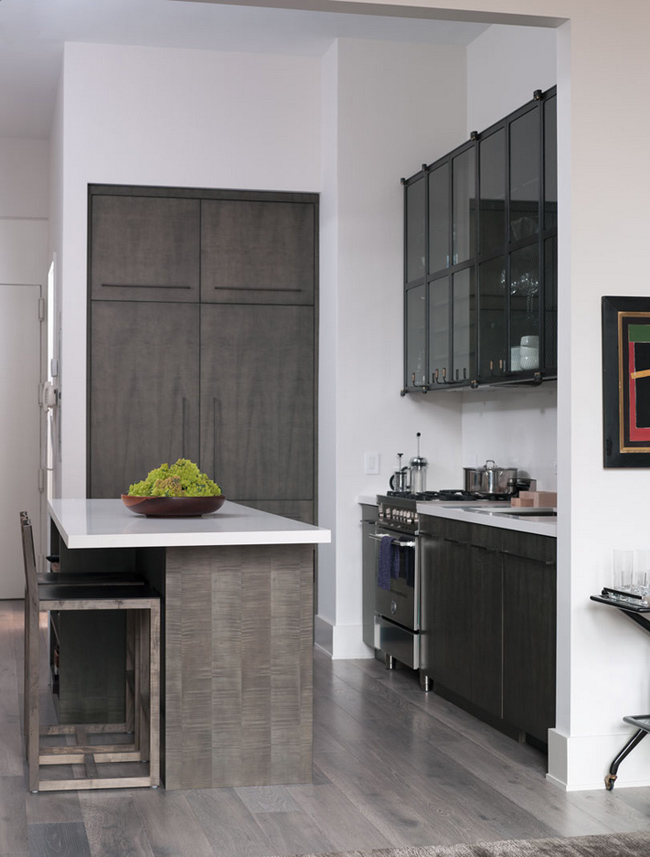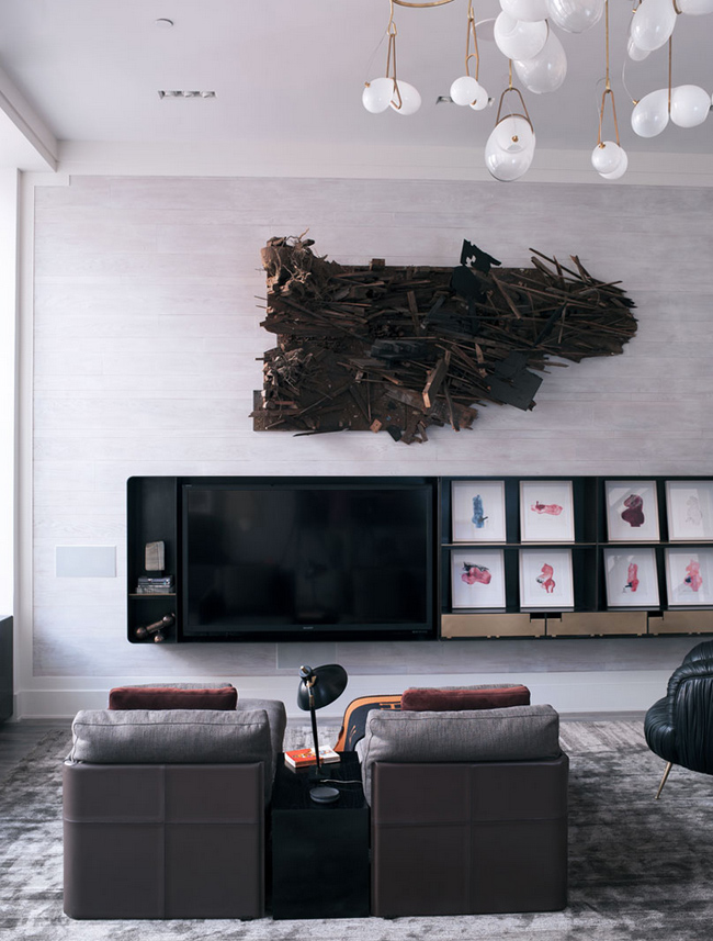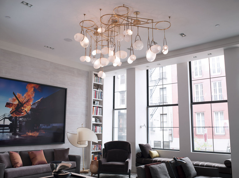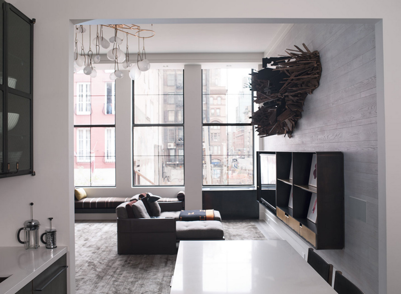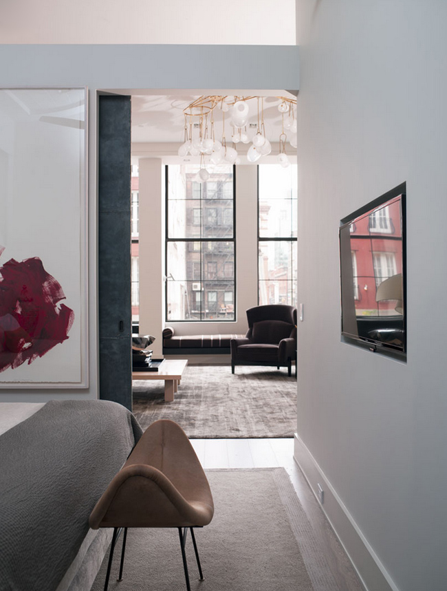 Yes, I continue to have lofty dreams. This loft, again by DHD Architecture and Design is a gorgeous blend of industrial and chic. This pied-à-terre loft with soaring fourteen foot ceilings, sits within a classic cast iron building in the heart of Noho, NYC. It is home to a couple who are serious about their art. The wide plank grey oak floors and white gallery walls set the palette for an art filled environment. A custom designed silk rug fills the main space, while the large-scale Lindsey Adelman light installation hangs above. The furniture, a mix of vintage and classic contemporary, were carefully curated to create a home that is elegant and subtle yet eclectic. The use of cowhide, mohair, woven leather and velvet create subtle textures against the painted brick and wood planked walls. (Photos: Rick Lew)