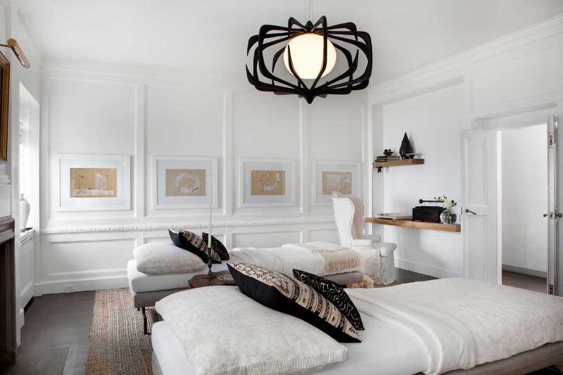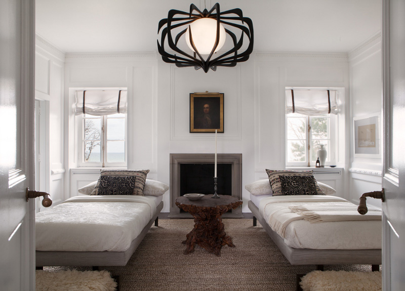 the room is serene but the light fixture is spooky