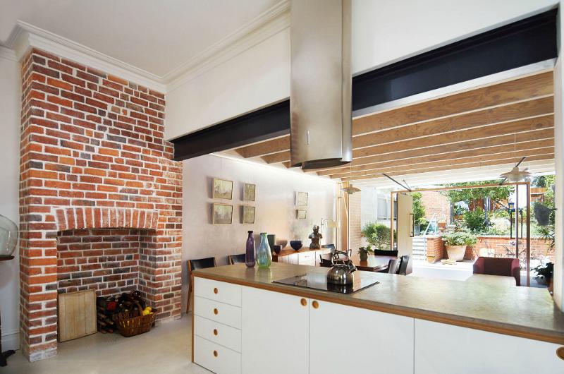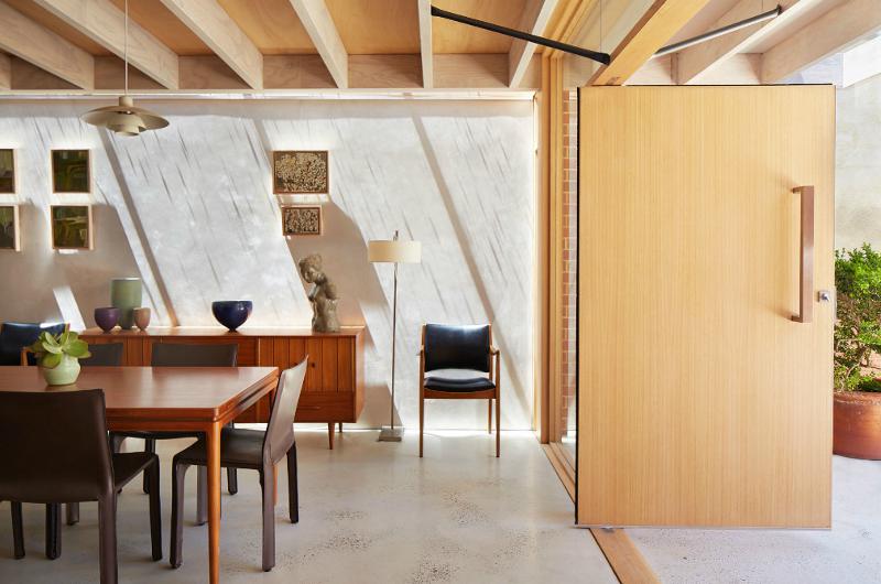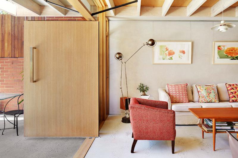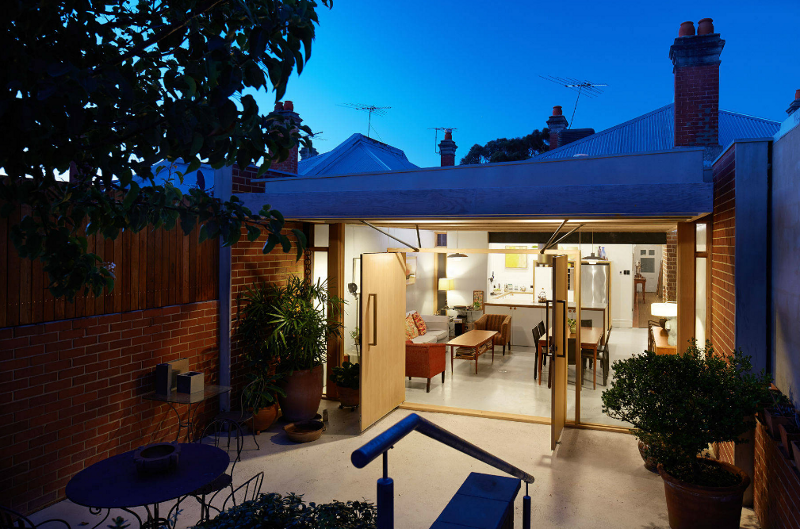 Like many of the Australian houses I feature here the Trellis House by West Australian design firm Fringe Architects involves an extension to a late 19th/early 20th century building. These inner city homes are small, often dark and not at all suited to our modern way of life. Their location in desirable inner city suburbs will see owners extend them to embrace more space, the open plan living we all desire these days and an almost culturally ingrained need for Australians to open the indoors to the out. This Perth home sees the marriage of old and new, modern with mid century, polished concrete, exposed brick and a set of pivoting doors that would not be out of place in a Palm Springs mid century pad.