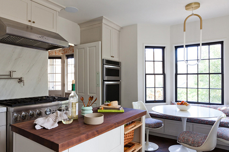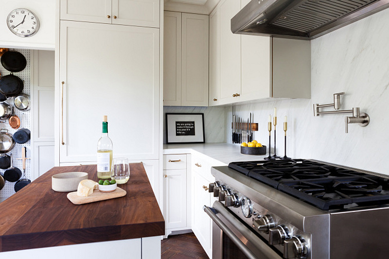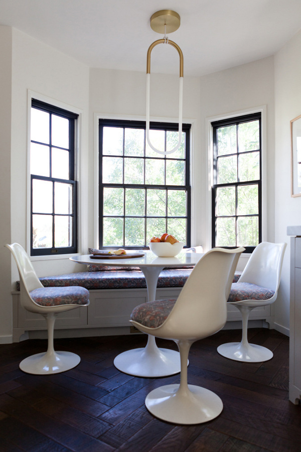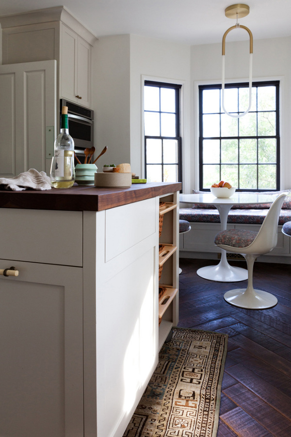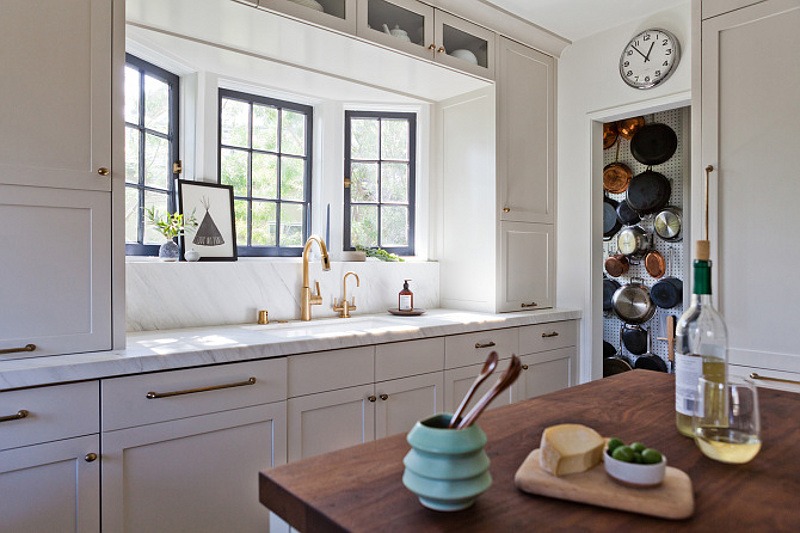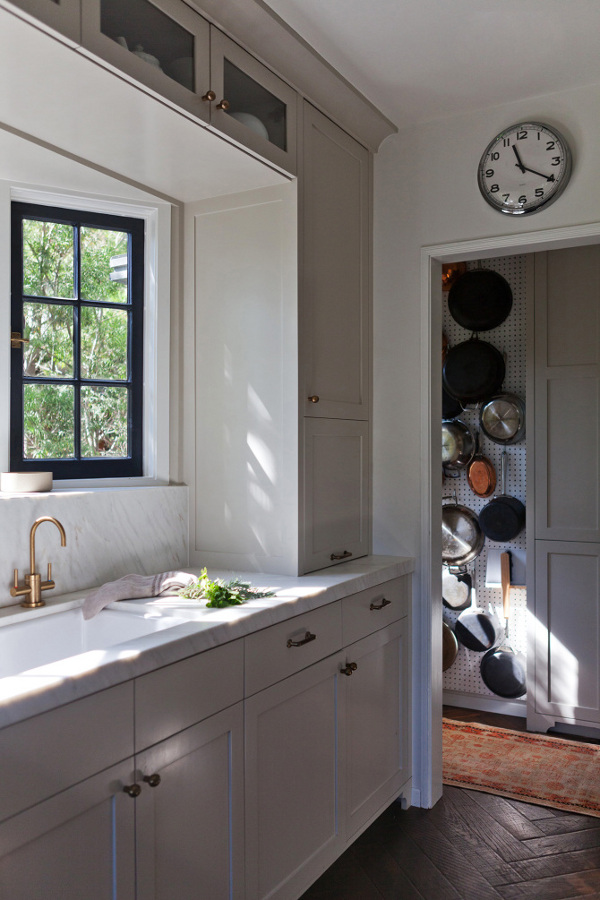 I love a good eat-in kitchen. Nothing too big or too fancy. Somewhere to create great food and great family memories. And I love this kitchen by Los Angeles based interior designer Amy Sklar. The floor, the moveable island bench, the mix of metals, the wall of pots and pans and those sweet little windows above the sink.