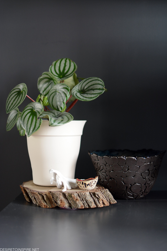 cheap pot I need to replace with something cooler, ceramic bug from Wunderkammer, bowls by Julie of Hollow clayworks