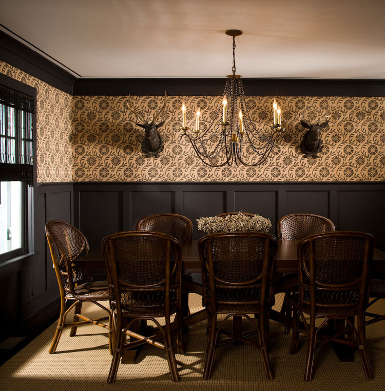 It has been a very long time since we last featured the bold spaces of Kemble Interiors. Mostly Palm Beach glam packed with bright colours and patterns which is not a style I’m generally drawn to, the Kemble ladies can knock out other styles as well. Flavours that are more neutral as well as Hollywood Regency designs I am quite taken with and these rooms are among my favourites. I totally love the dining room above, despite its traditional vibe. Must be the black painted wainscoting with graphic floral wallpaper above 😉