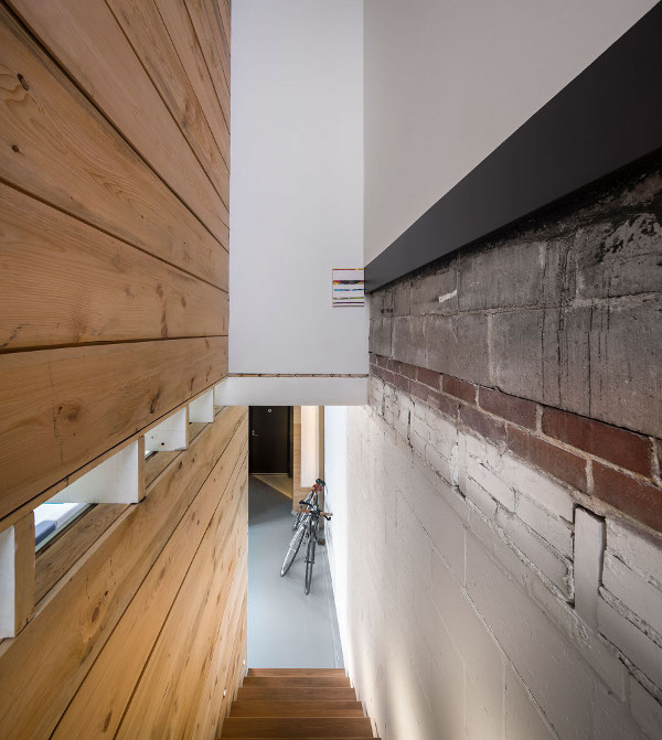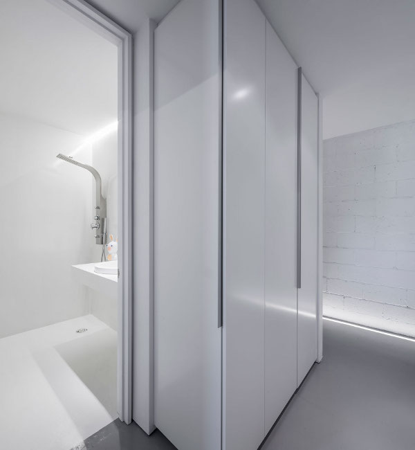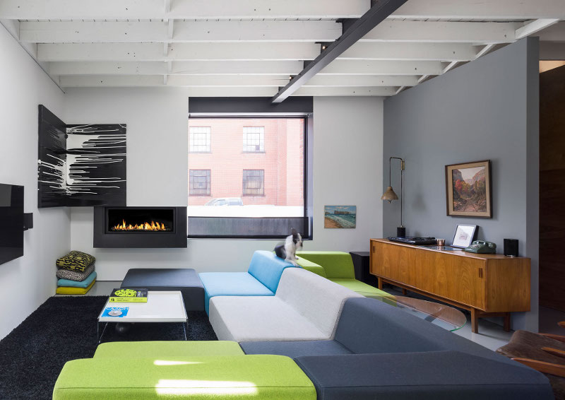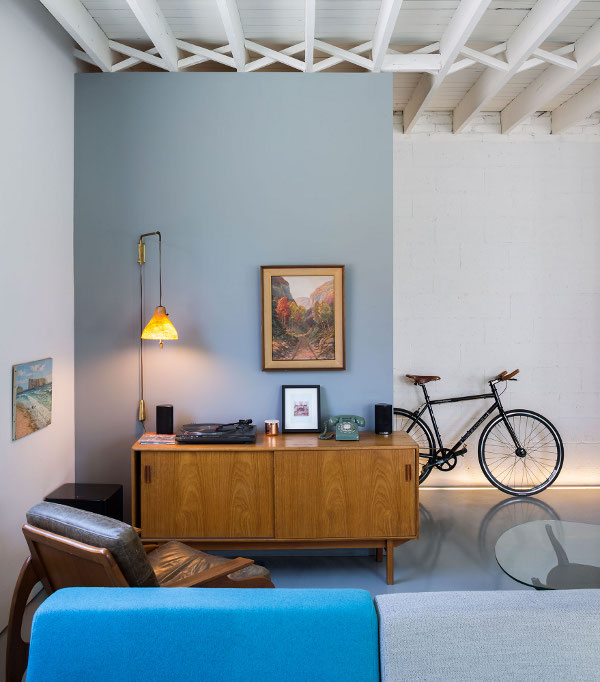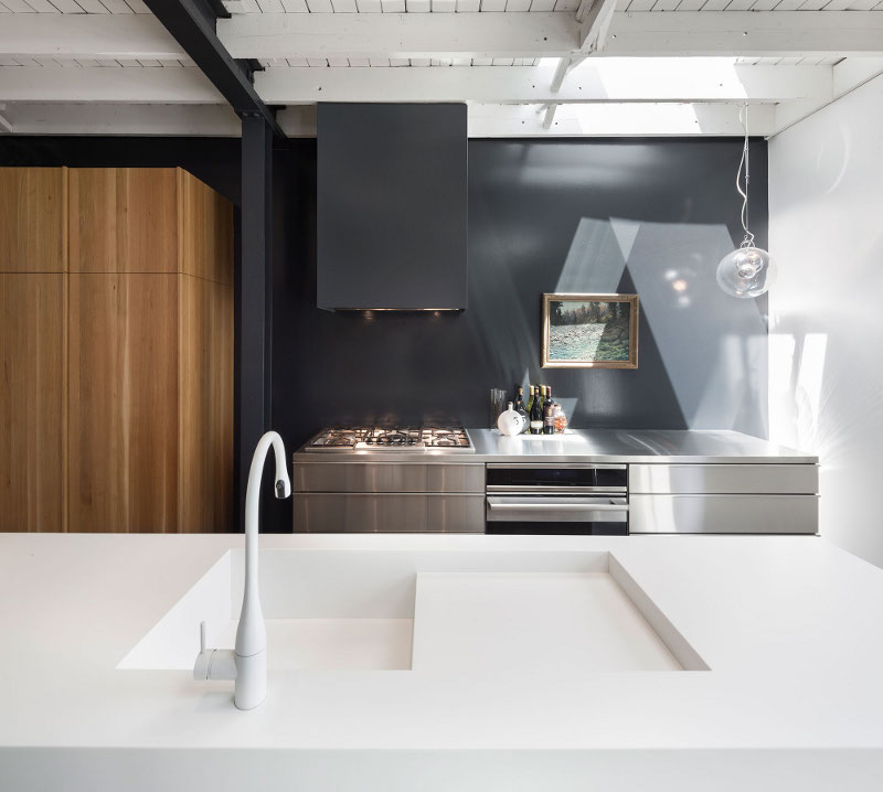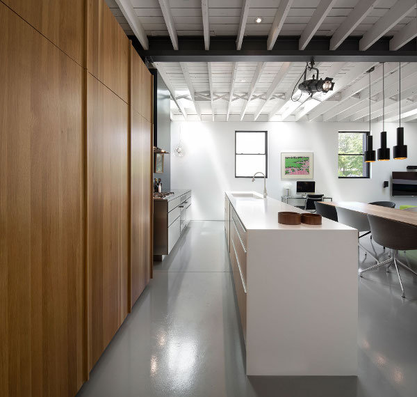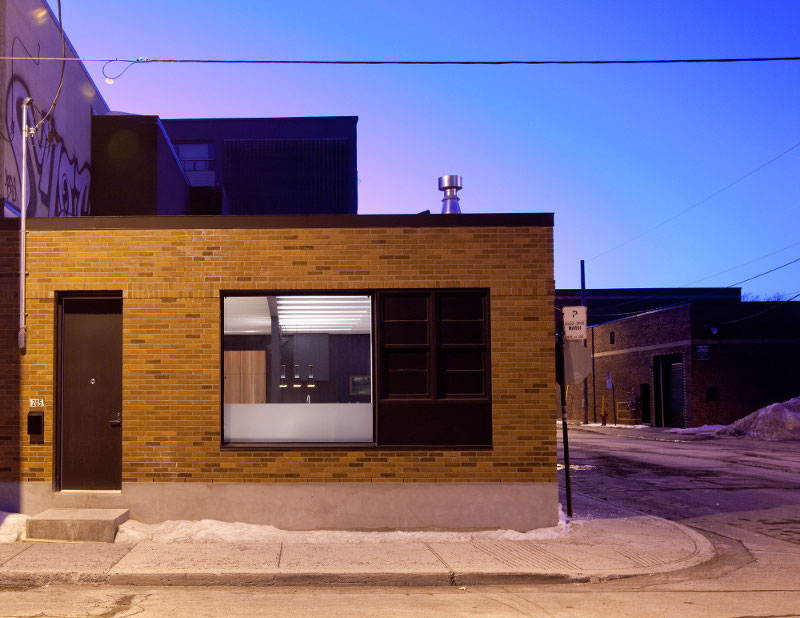 Step inside the unassuming facade of this 1950s warehouse and you’ll find a minimalist open plan home. Hints of the building’s industrial past remain but as a shell that contains this super slick modern space. Seamless Corian benches, stainless steel, strip lighting and painted concrete play against a mix of contemporary and mid century furniture. I would, however be more at ease with this house if they would just move the shaving mirror away from the ethanol heater. Ouch! Is it a clue that the owner is hot stuff? Le 205 in Mile-Ex district of Montreal by Atelier Moderno.