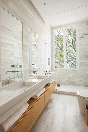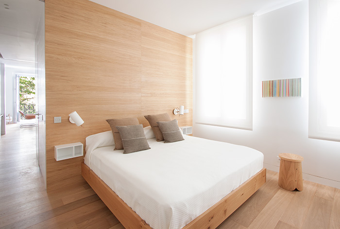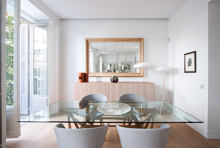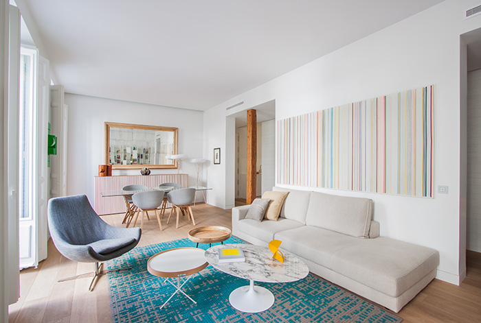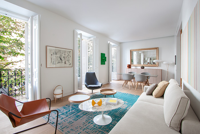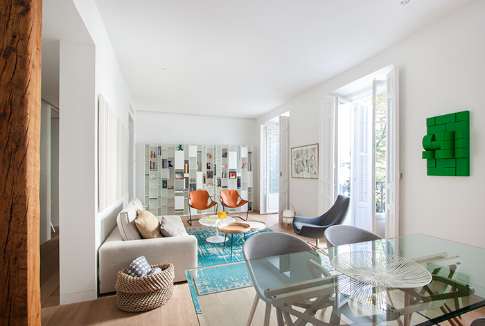 Crisp, contemporary lines within an older building. White walls bounce light while splashes of colour in furnishings and art, wide oak planks, original posts and warm wood tones ensure that the spaces are not sterile. Casa CC58 in Barrio Salamanca, Madrid by Lucas y Hernández-Gil Arquitectos.