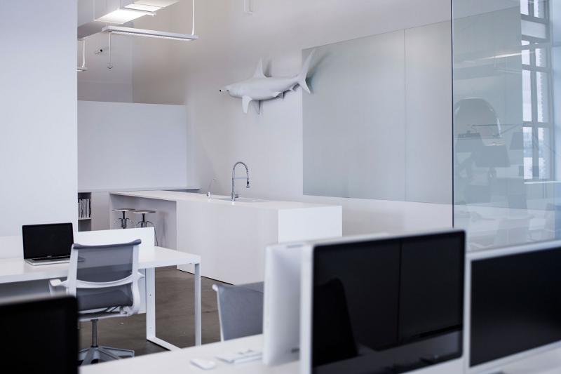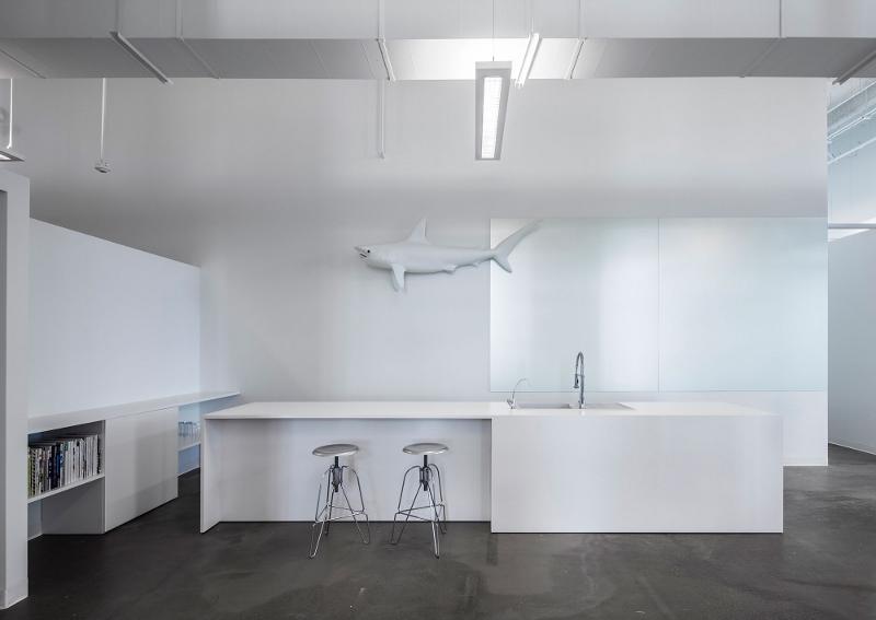 There is something clean, contemporary and killer about the Blue Communications office by Montréal-based Atelier Moderno in collaboration with Anne Sophie Goneau and I’m not just talking about the life size sharks floating around the walls. I still can’t believe I have found two workspaces in a matter of weeks that feature sharks as a design statement. A company mascot or perhaps a work ethic? Anyway as I always say if you have to drag your sorry self into work on the weekend it helps if it’s somewhere stylish.