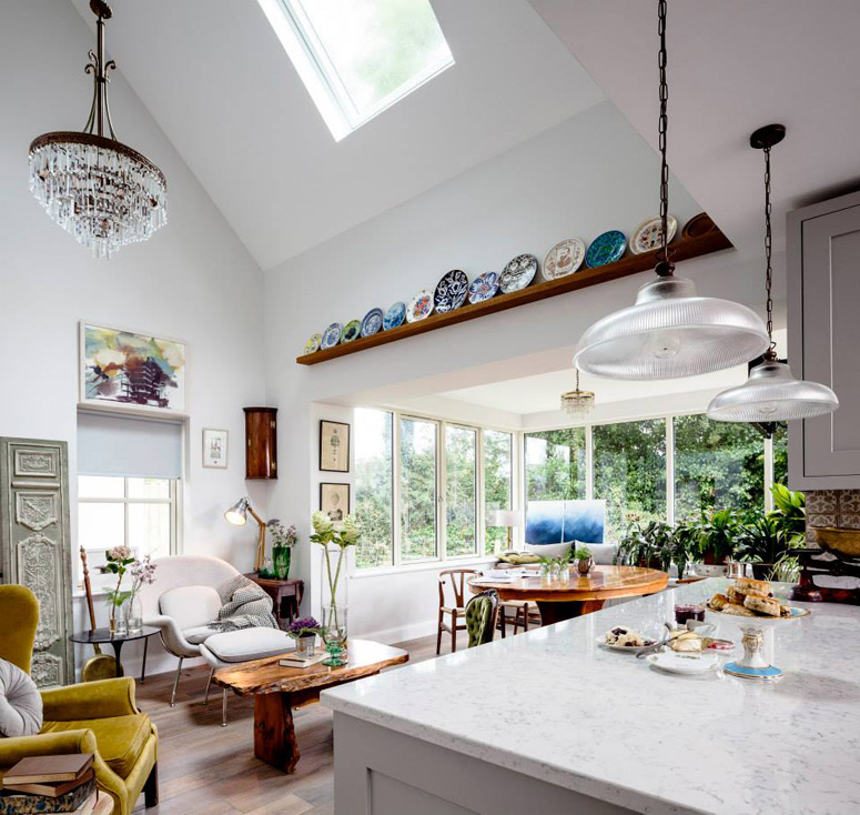 I cannot be stopped! Here is yet another blog-worthy project by the immensely talented architecture and design firm Kingston Lafferty Design. This extension and renovation project of a 200 year old stone cottage is the perfect eclectic contrast of traditional and modern architecture, of “granny” and mid-century furnishings (Saarinen Womb chair and side table, Wegner Wishbone dining chairs and Shell chair and Eames walnut stool for the win!) and the unexpectedness of it all is so intriguing.