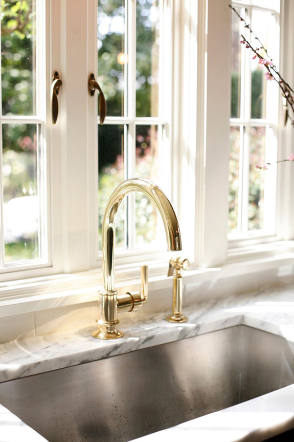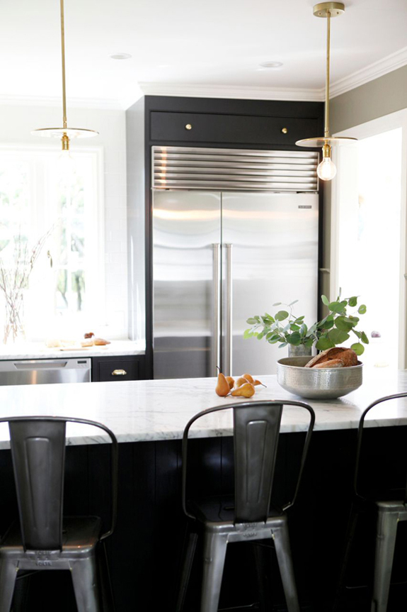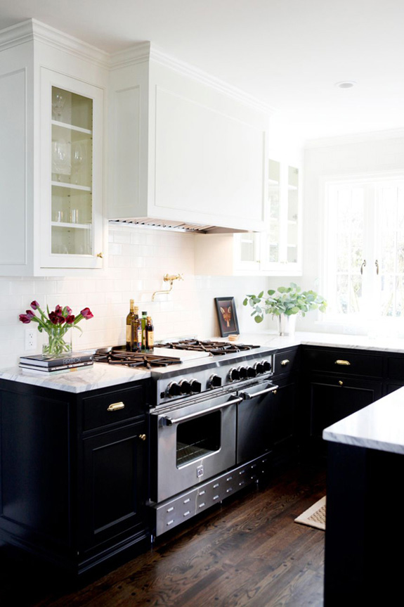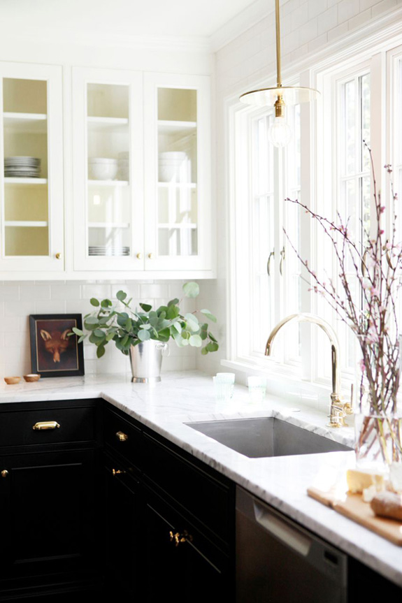 Nothing says classic like a black and white kitchen – especially white uppers and black lower cabinets. Throw in a white marble countertop, gold pendants, faucets and hardware, some Tolix stools and a marble Saarinen tulip table and you have just about the best combination EVER. Again via H2 Design + Build