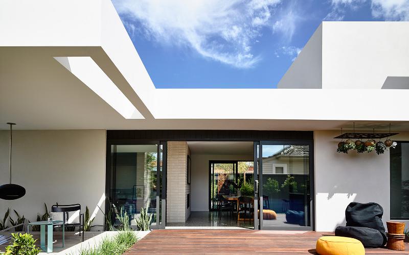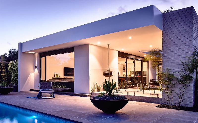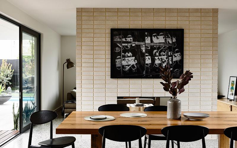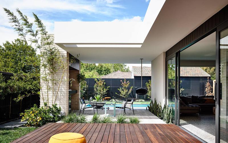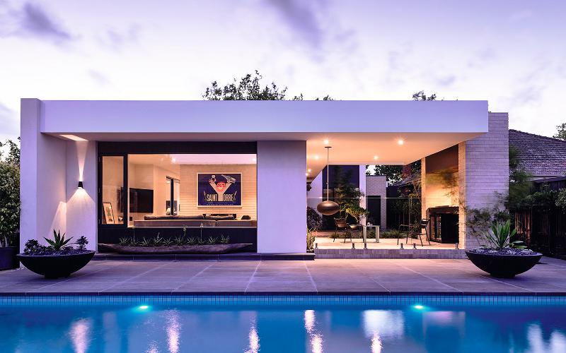 From design to construction, that’s the holistic approach of Melbourne-based InForm Design. Their Alphington house consists of two halves. The two-storey ‘Quad’ front section is designed to take advantage of park views from the first floor master bedroom and lounge. Out back is a single storey pavilion containing the living areas separated by a concrete block double-sided fireplace. These spaces spill out to the alfresco entertaining spaces and pool.