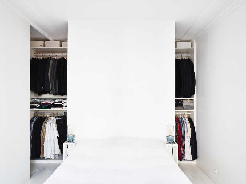 I love European architecture and the wonderful classic apartments that I come across when doing blog research. This simple, modern 60m² apartment renovation in the eleventh arrondissement of Paris by Septembre Architecture pushes all the right buttons. Some marble and custom cabinetry in the kitchen, some brass and hex tiles in the bathroom, glass doors and beautiful moldings. The rooms of the apartment are aligned to optimize the circulation and create a visual continuity. The suite of spaces seems to extend to infinity with a large mirror at the back of the apartment. Each room has a specific floor treatment, weaving a true Jacquard weave between wooden floors, painted wooden floors, hexagonal mosaic and polished concrete. Photos: David Foessel (Check out more of their work here and here)