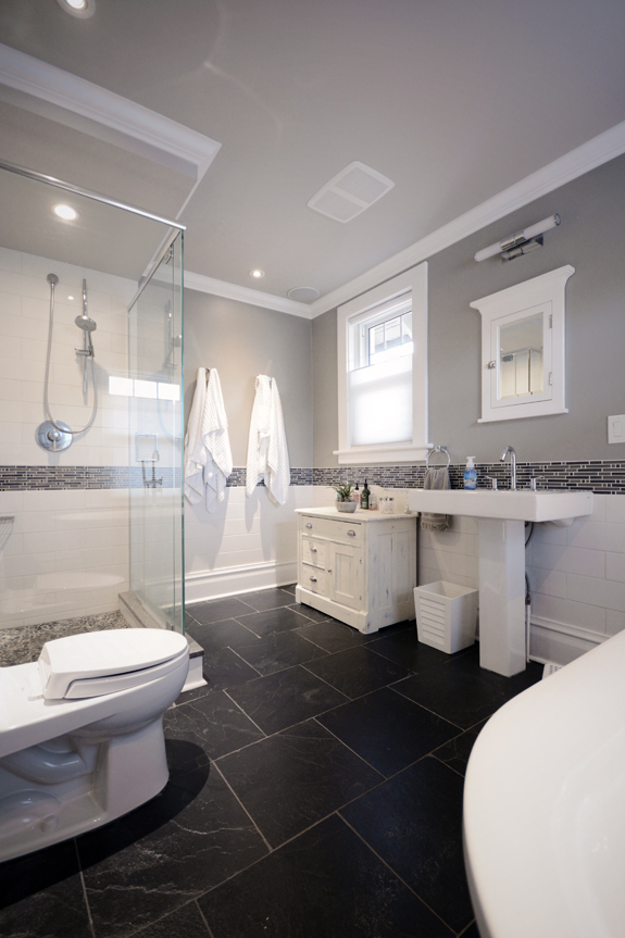 The secret gem behind the door at the end of the foyer. Formerly a closet, there was a pantry in behind so both were transformed into the tiniest of bathrooms, with the smallest sink and toilet Preston Hardware had in stock. I am totally jealous of this because I don’t have the space they do behind the closet to fit a bathroom. 🙁