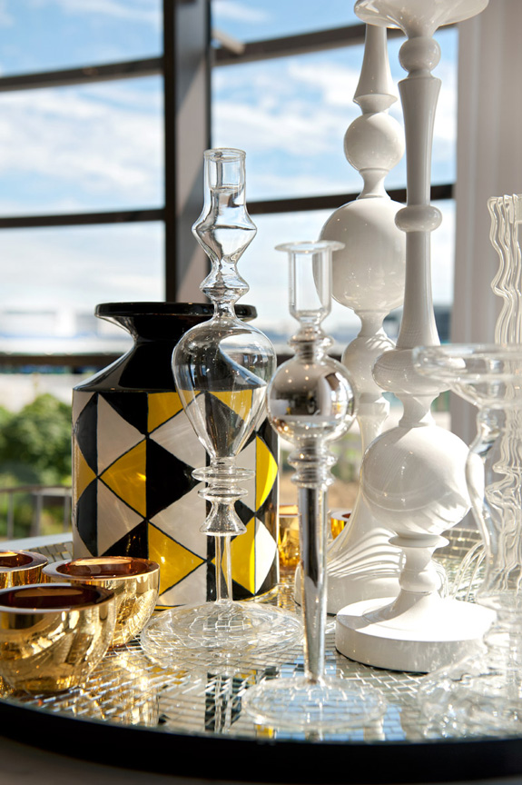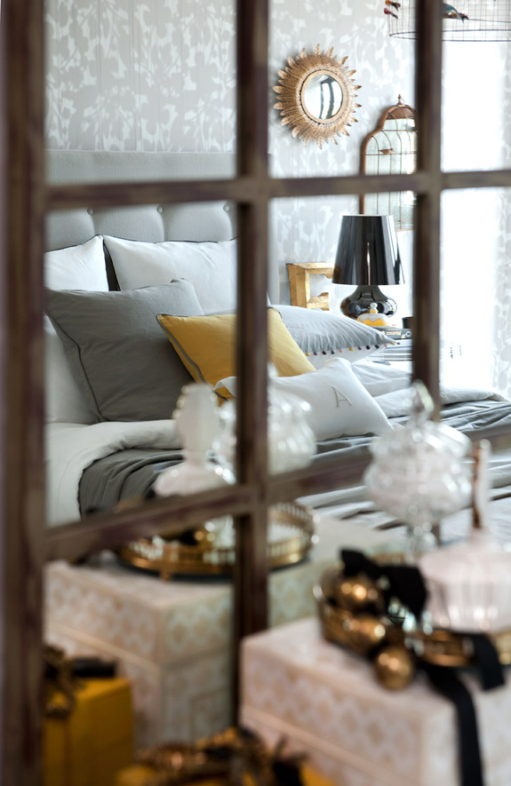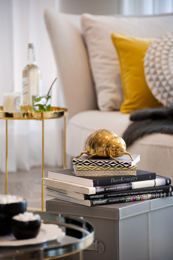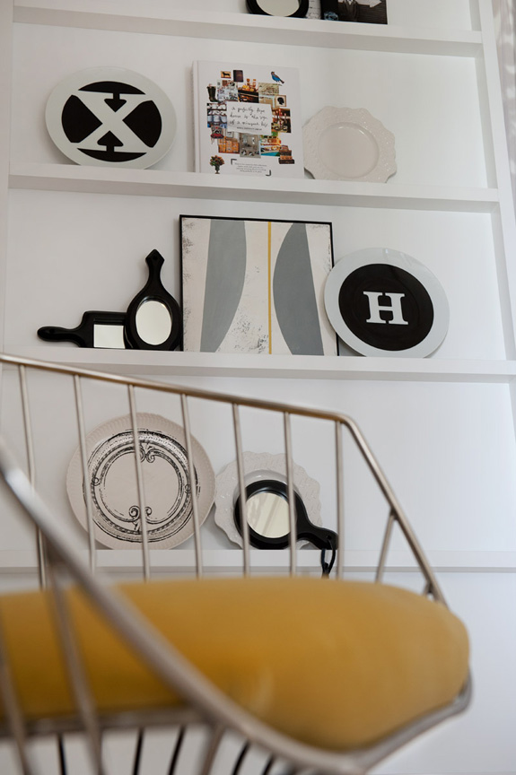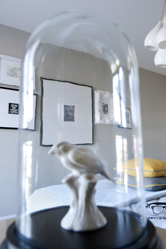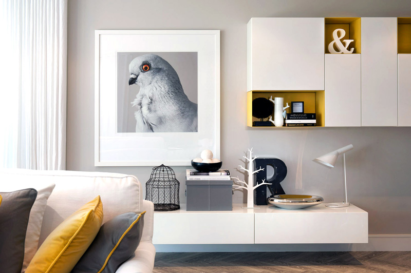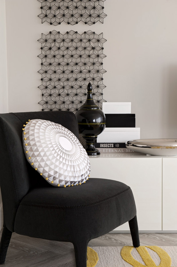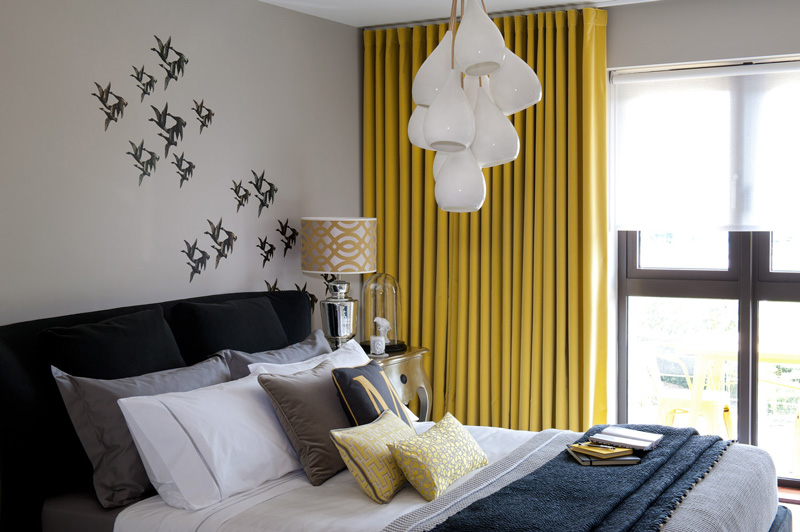 One of my personal favourite dramatic colour combinations is black, white, grey and yellow. This model apartment designed by British design firm Honky is modern and funky with cool whites, smoky greys with accents in black and yellow and bits of gold. Graphic and edgy works really well to reel in potential buyers. I adore the bird print above.