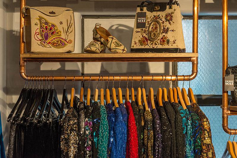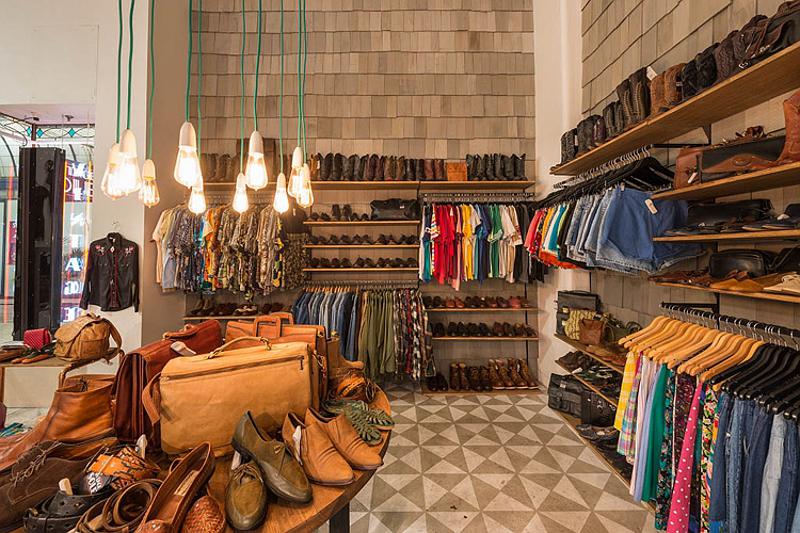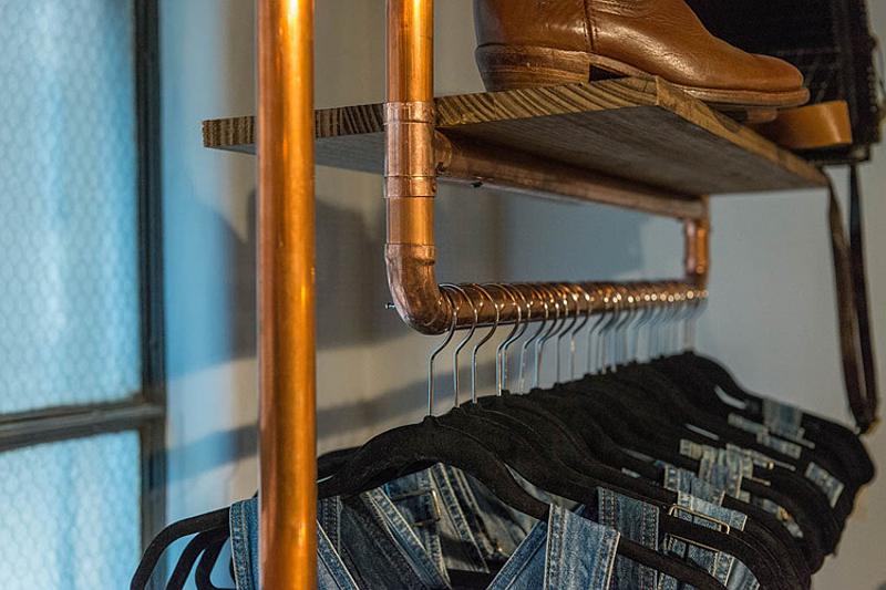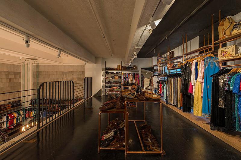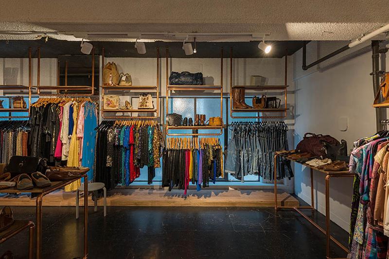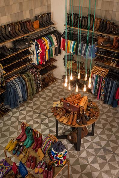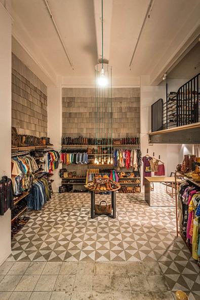 Saturday? Work day? Bummer! But there’s no need to be glum if you work in someplace stylish and fun. I’d happily drag my sorry self into work if I was a sales assistant at vintage clothing and accessories store, Vintage Sole, by Melbourne-based Moth Design. Yes cool clothes, yes copper pipe hanging racks but whoa, knockout stencil floor idea for those of us who can’t afford meters and meters of encaustic tiles.