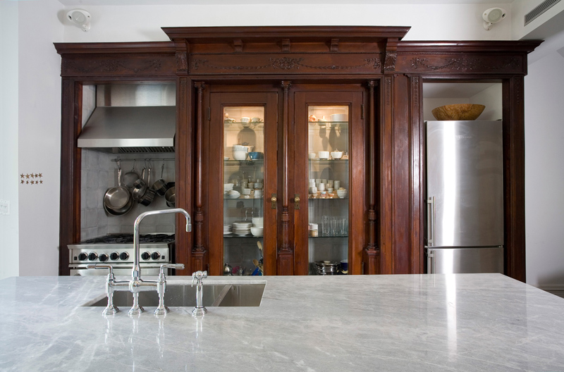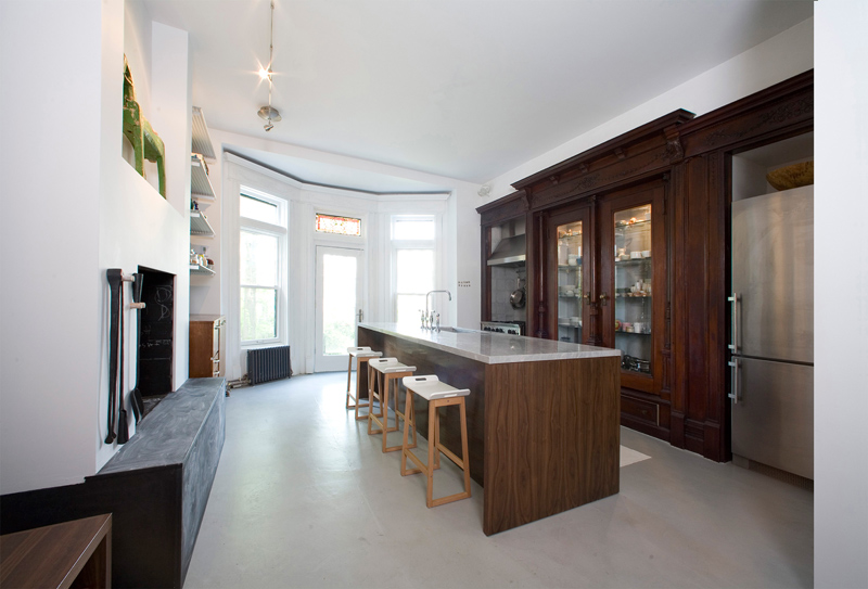 This kitchen is INCREDIBLE! In this extensively renovated Brooklyn brownstone by Elizabeth Roberts/Ensemble Architecture, the wood floor was replaced with a poured cement plaster floor and the original wood closet was retrofitted to contain the kitchen cupboard, gas range and refrigerator. Brilliant!